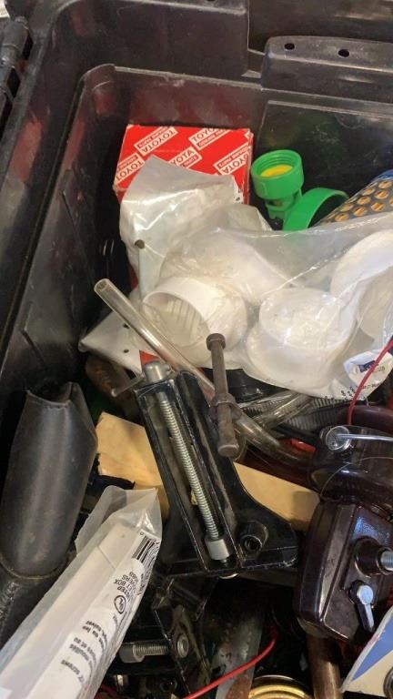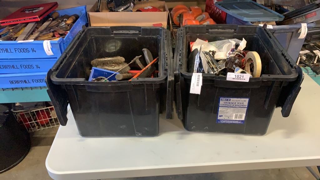 2 TOTES OF TOOLS, SHOP SUPPLIES, FISHING REELS