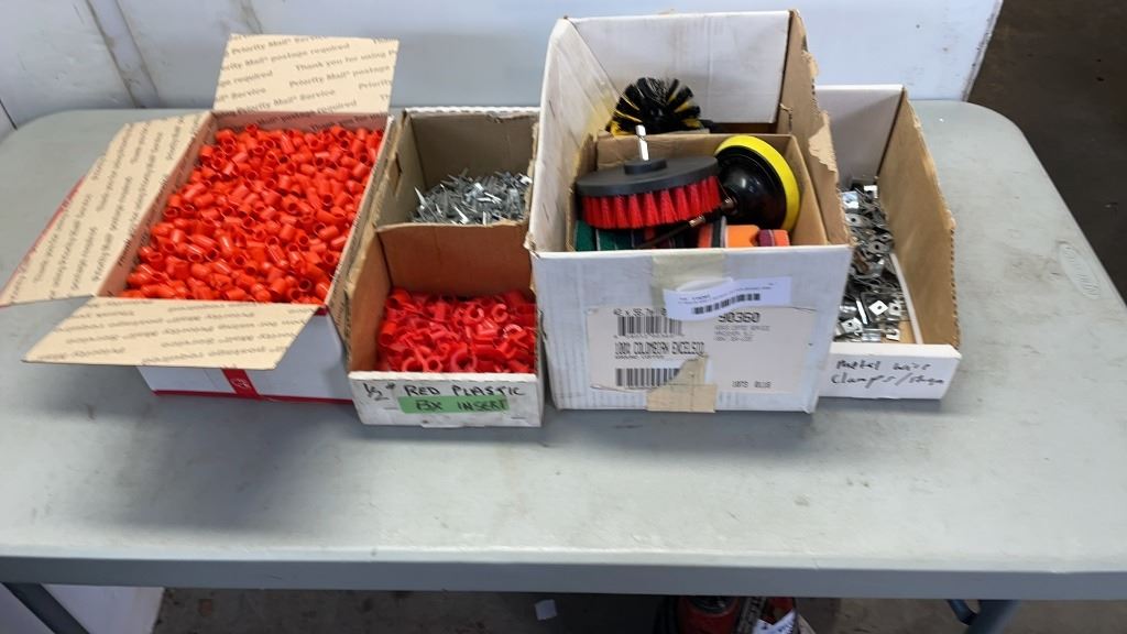 2 TRAYS AND 2 BOXES OF POLISHING AND CLENAING DRILL BITS, ELECTRICAL HARDWARE, TACKS, RUBBER CAPS