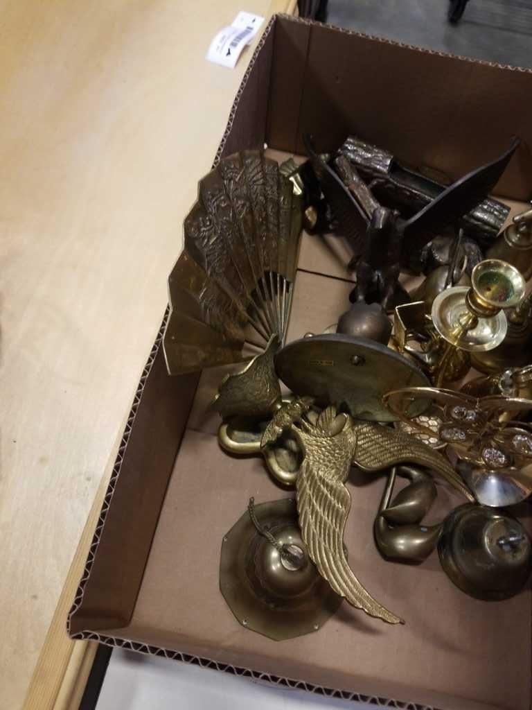 2 TRAYS BRASS AND OTHER DECOR, FIGURES, BELLS