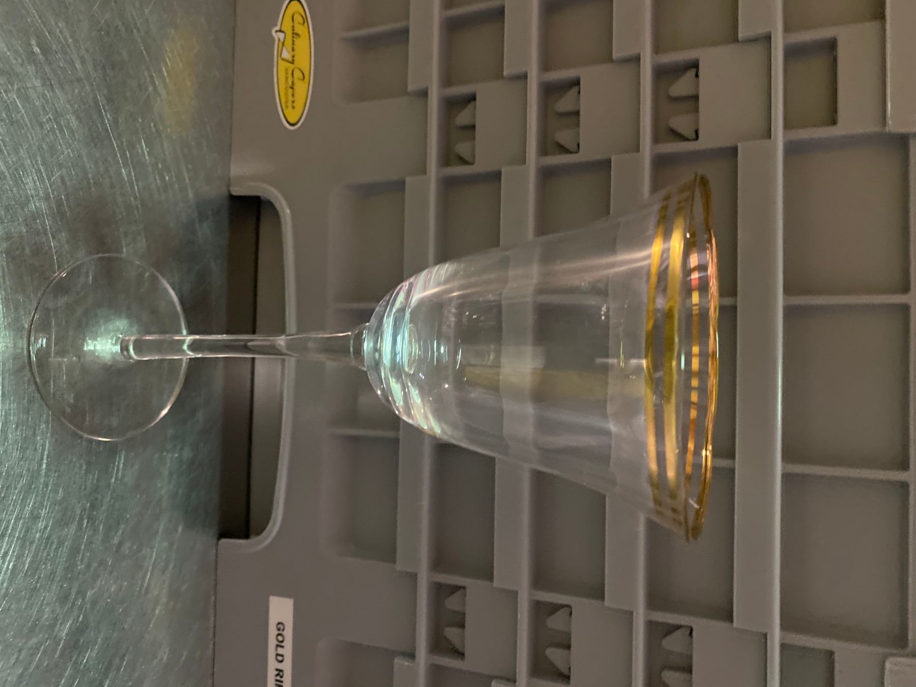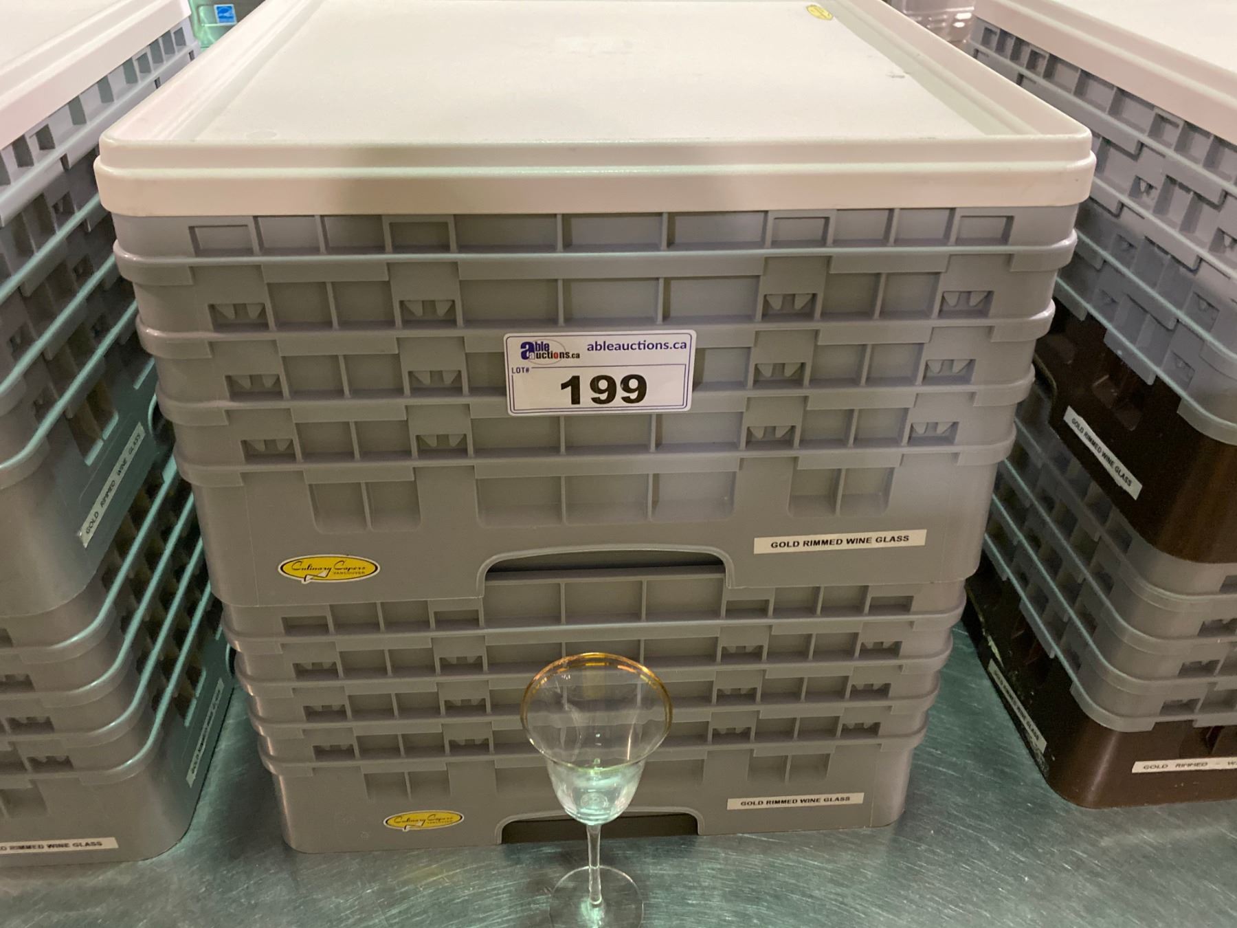 2 TRAYS OF APPROXIMATELY 40 GOLD RIMMED FLUTED WINE GLASSES
