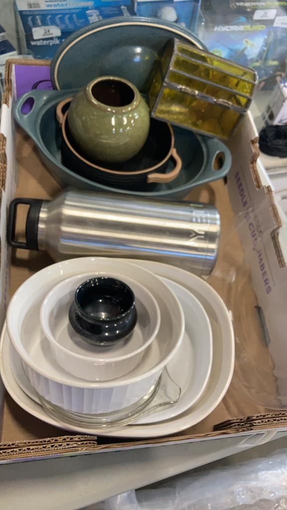 2 TRAYS OF BAKEWARE, GLASS CARBOY, POTTERY VASE, YETI THERMOS
