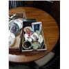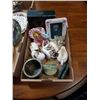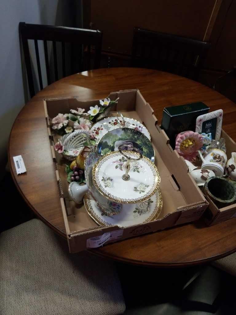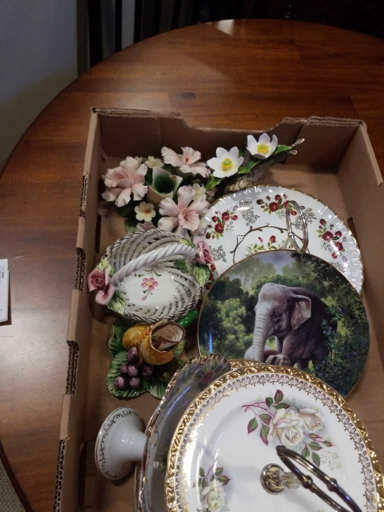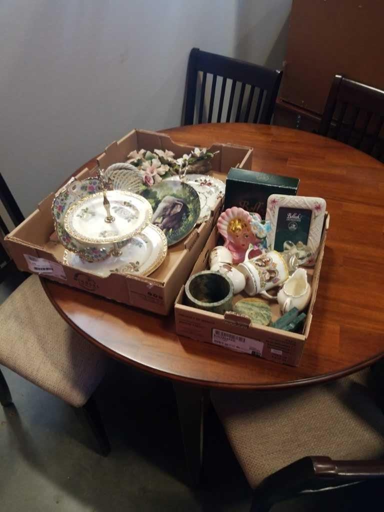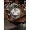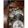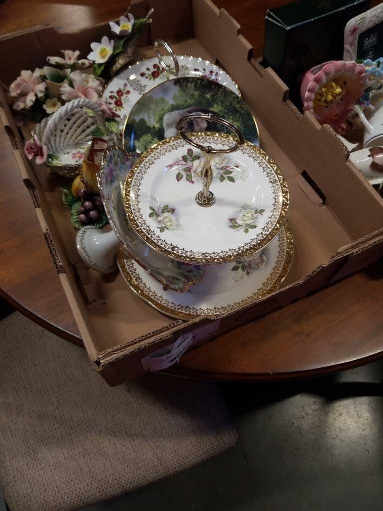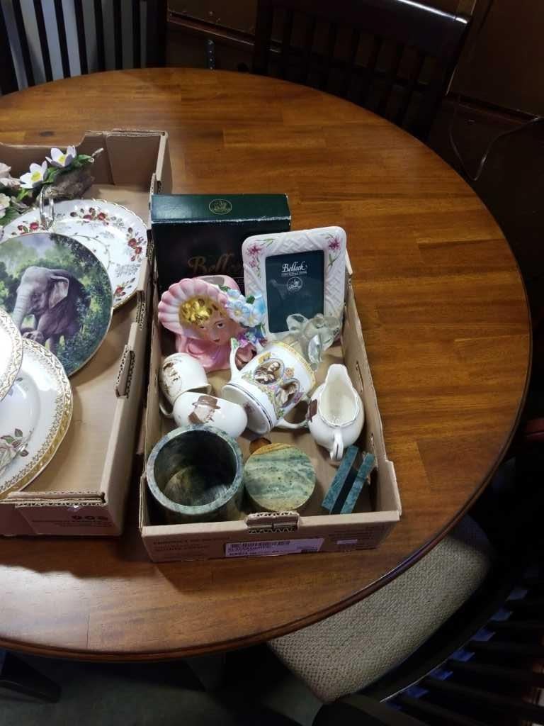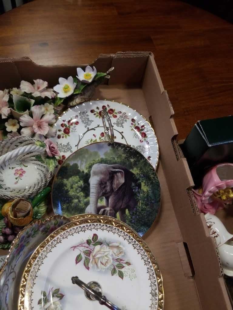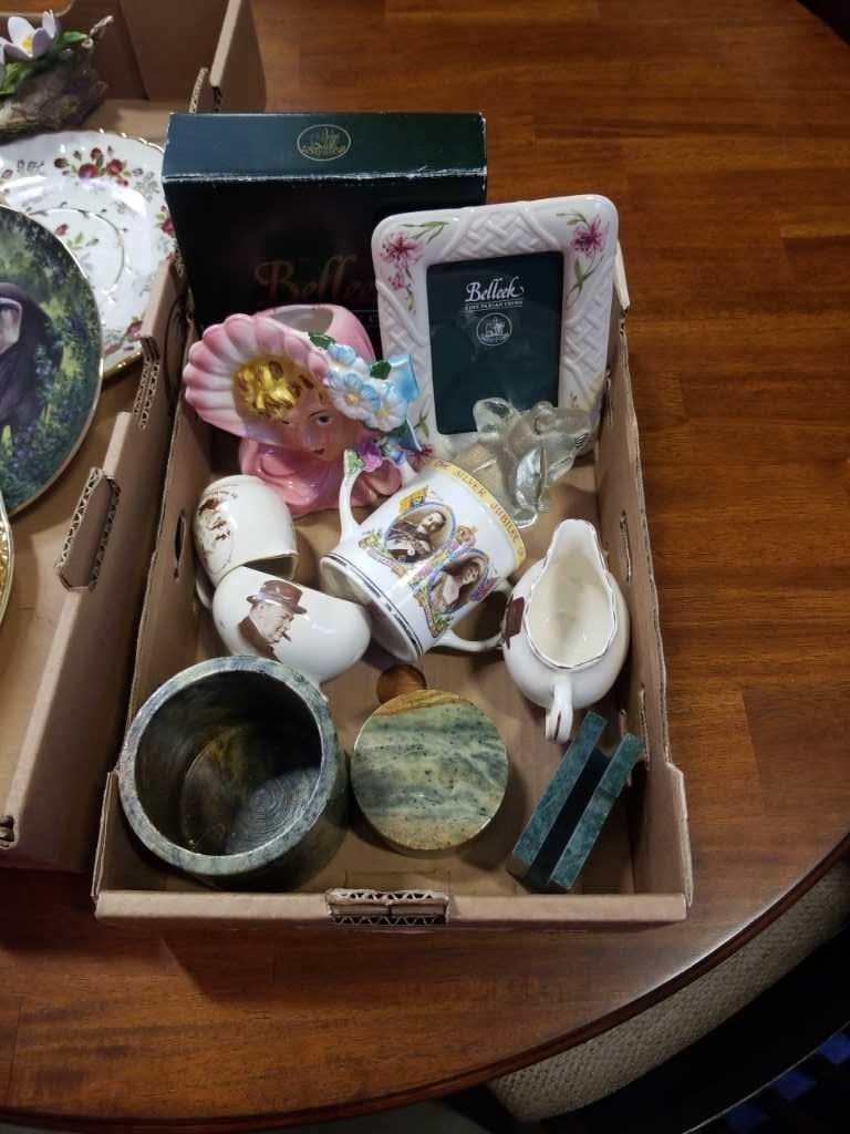 2 TRAYS OF CHINA, CAKE PLATTERS, FLORALS, COLLECTABLES, BELEEK PICTURE FRAME, STONE JAR