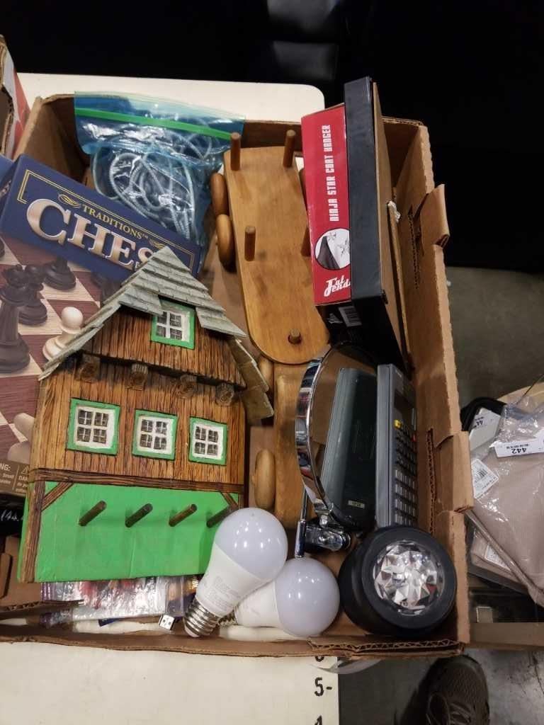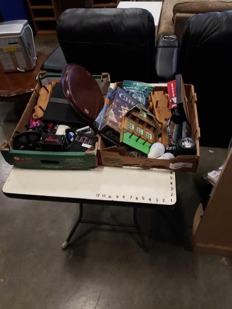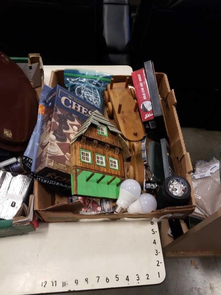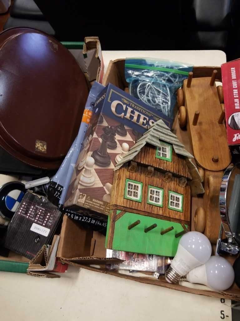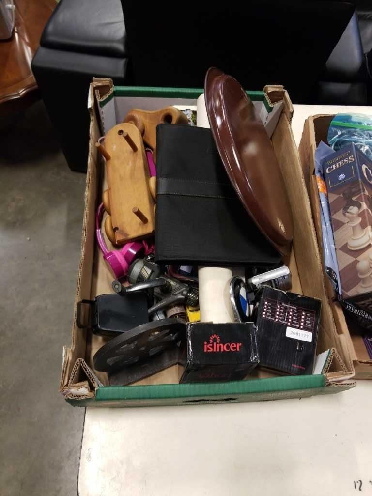 2 TRAYS OF COLLECTIBLES, FISHING REEL, WOOD CARS
