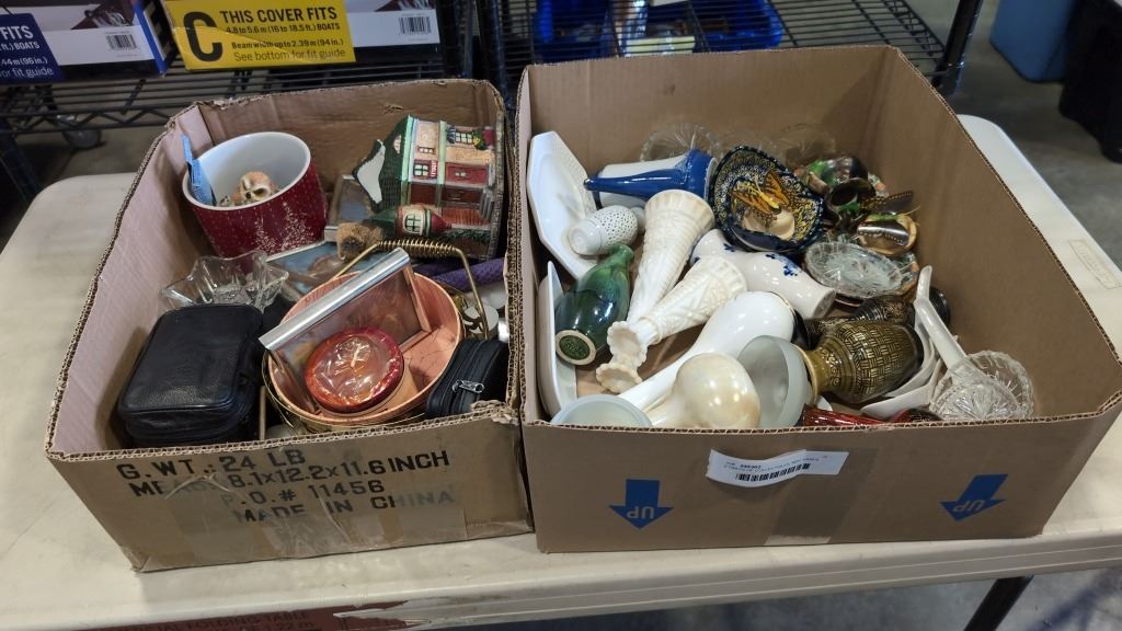 2 TRAYS OF COLLECTIBLES, MINI VASES ETC