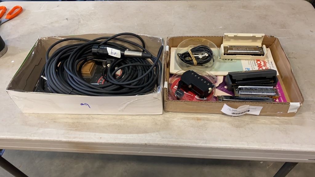 2 TRAYS OF HARMONICAS, GUITAR CORDS, MICROPHONE