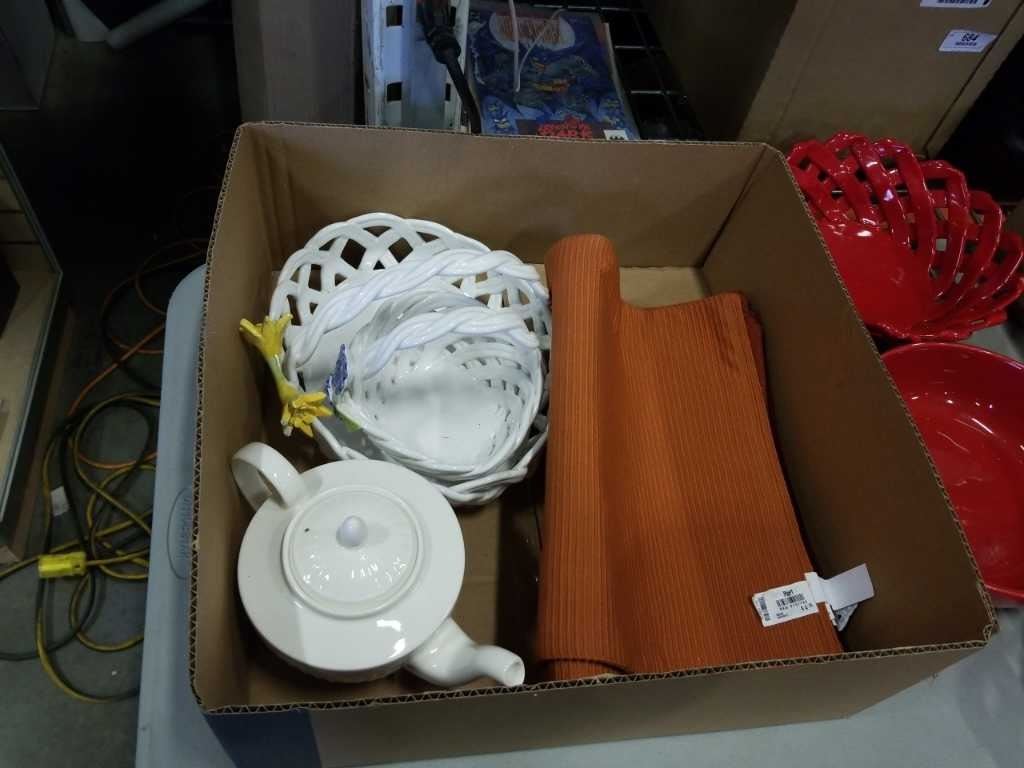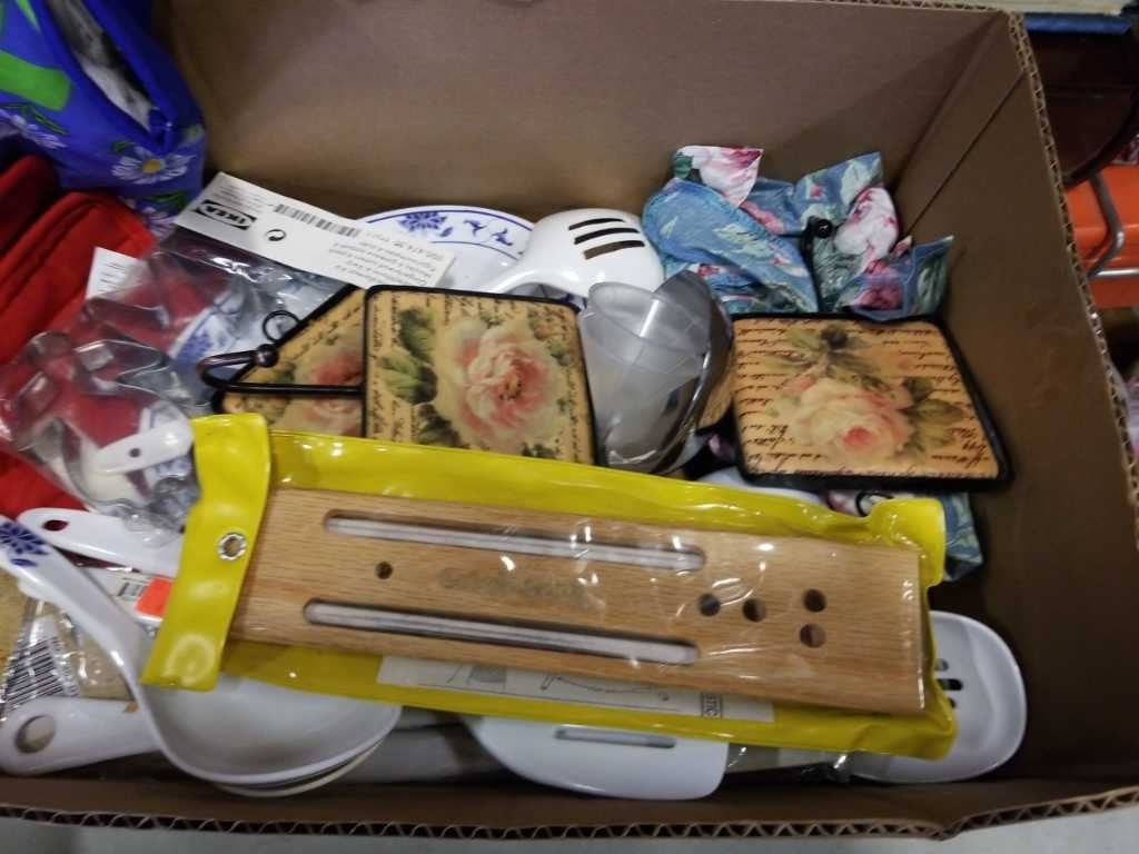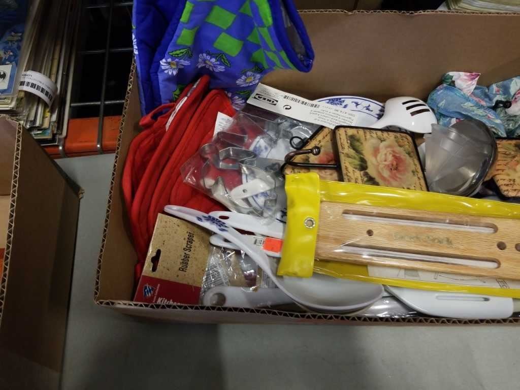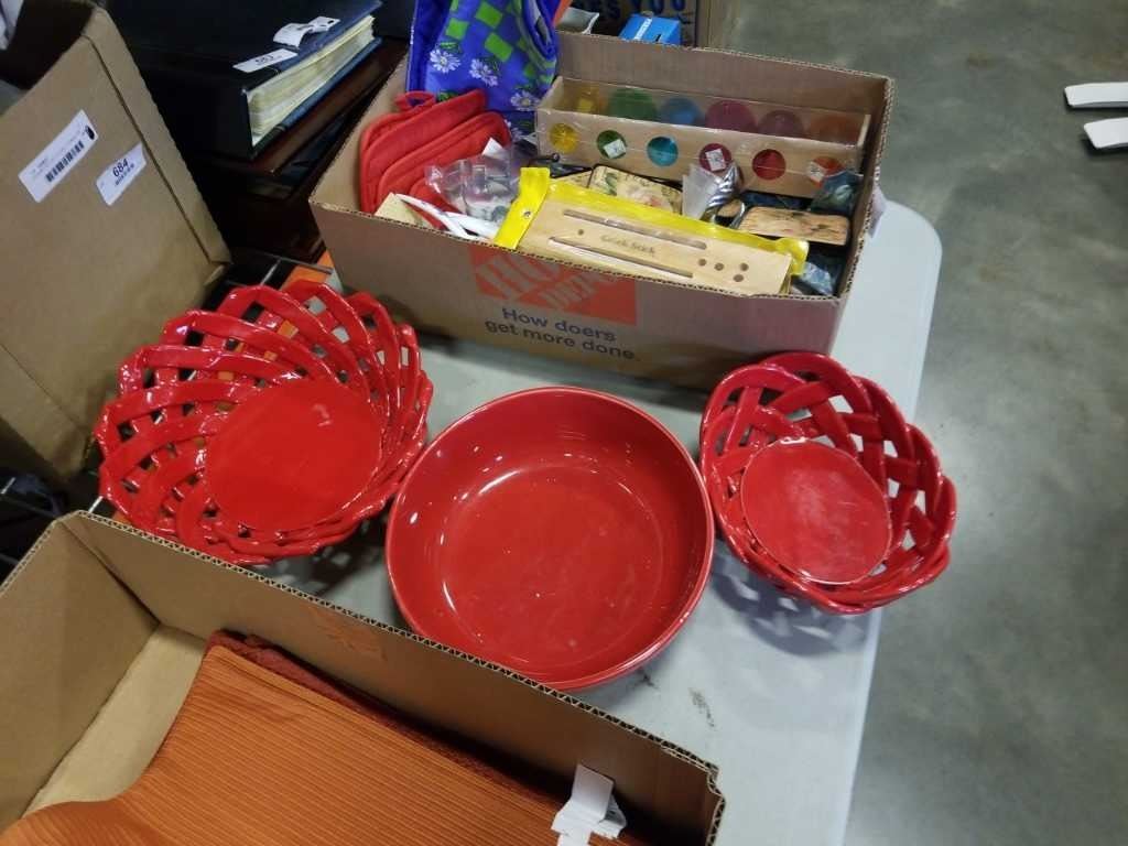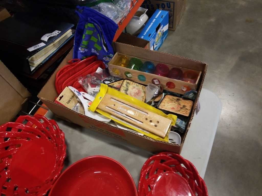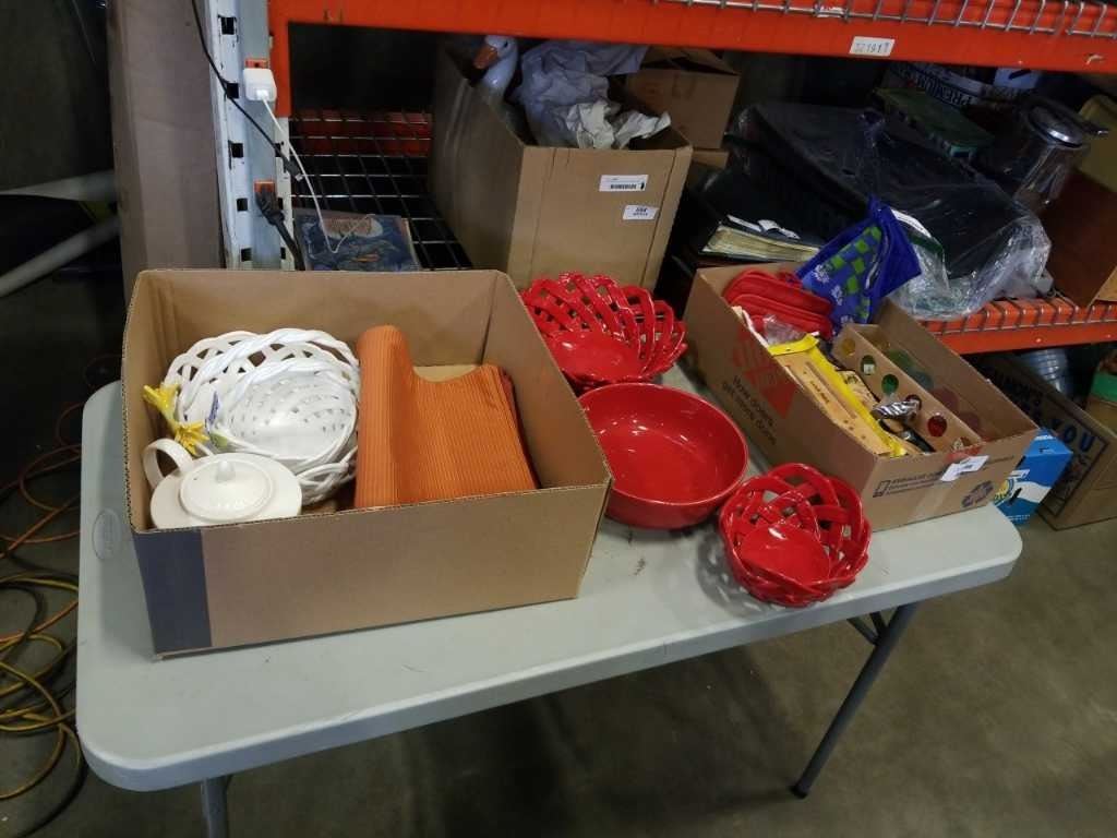 2 TRAYS OF KITCHEN ITEMS, DECORATIVE BOWLS