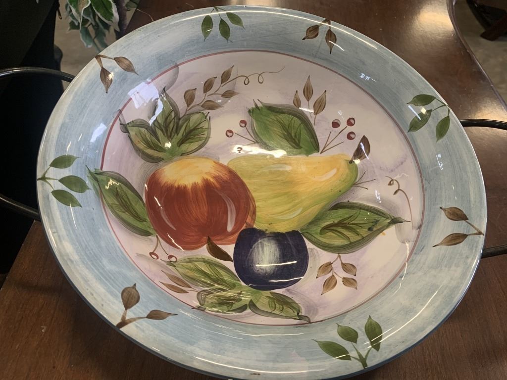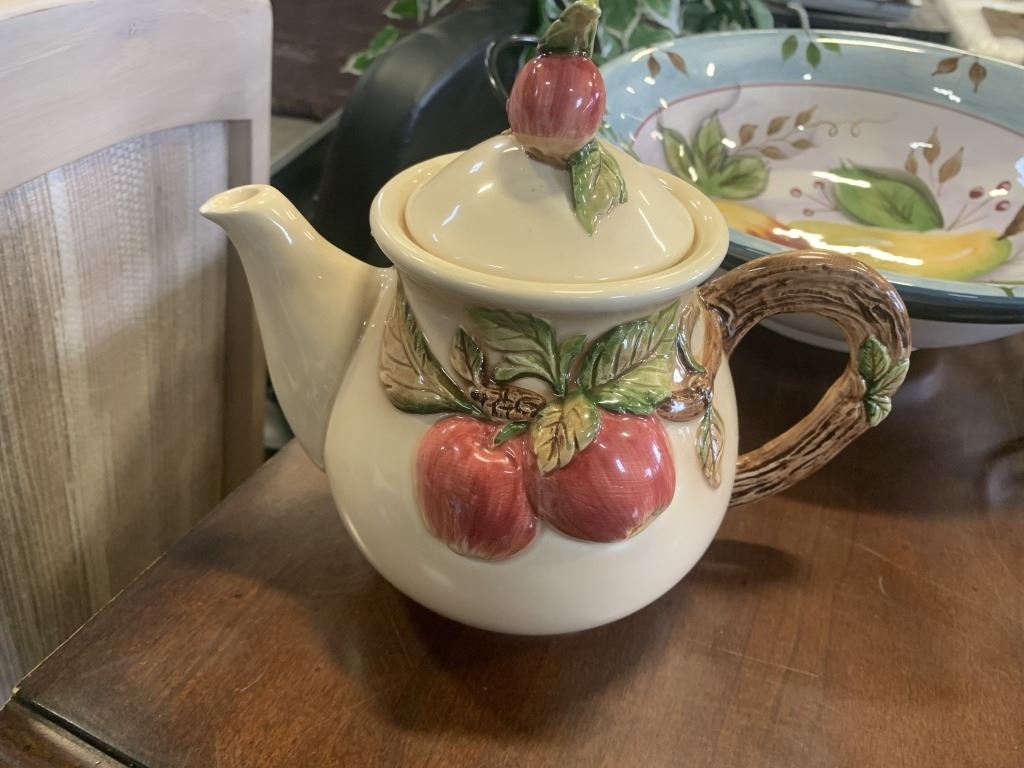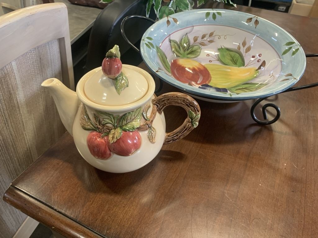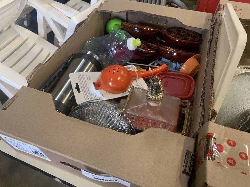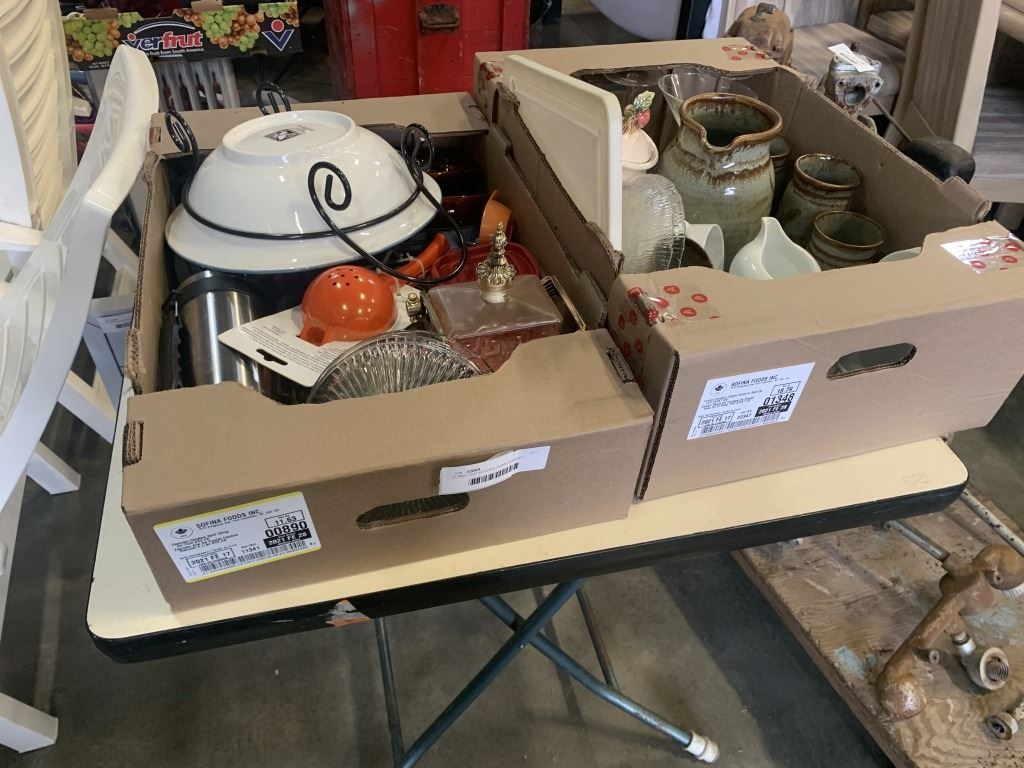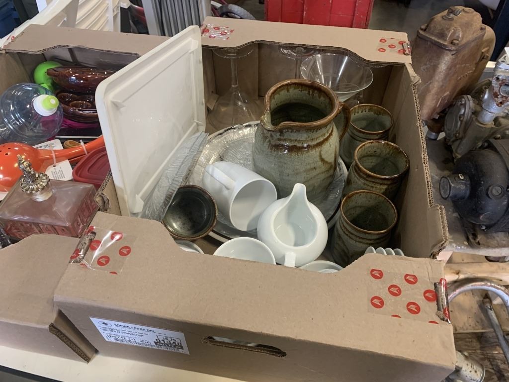 2 TRAYS OF KITCHEN ITEMS, SERVING PIECES, TEAPOT, CAR DECANTER