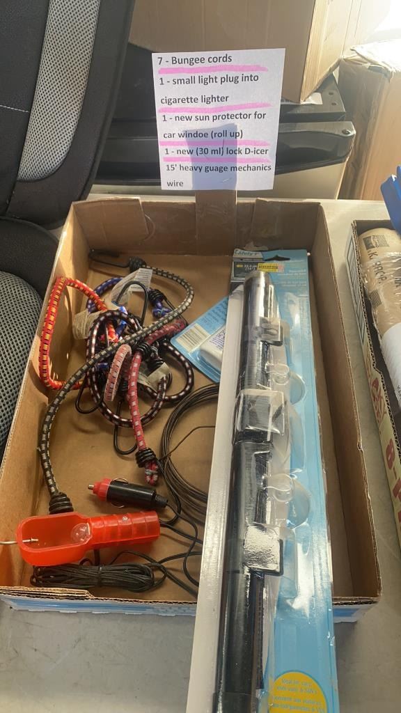 2 TRAYS OF NEW AND USED ITEMS - RATCHETING BIT SET, GASKET SEALER, BUNGEE CORDS, LOCK DEICER, CAR SEAT CUSHION, ETC