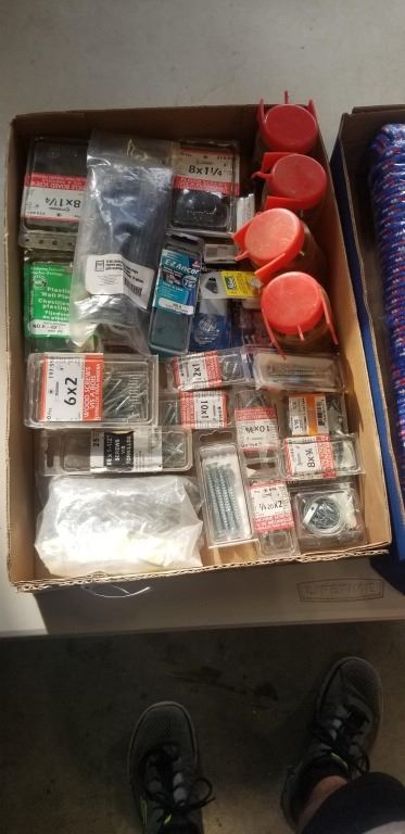 2 TRAYS OF NEW SCREWS AND BUNGEE CORDS, ROPE, ETC