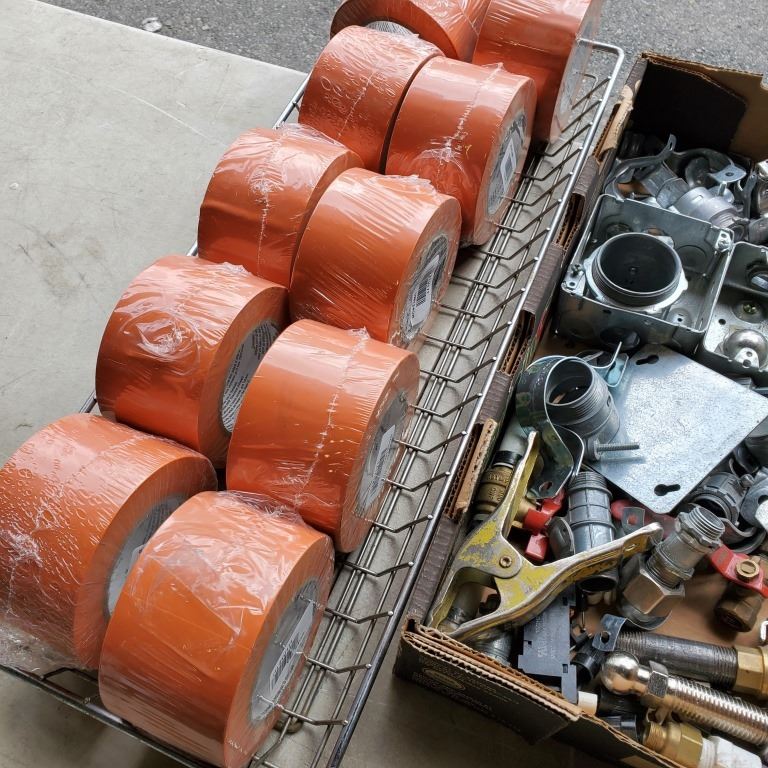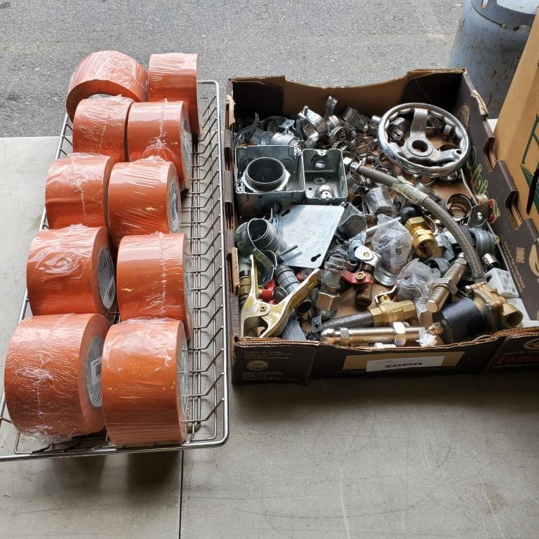 2 TRAYS OF NEW VINYL TAPE, PIPE FITTING AND CLAMPS