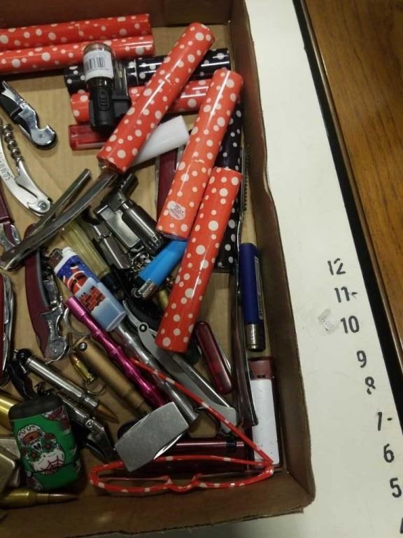2 TRAYS OF RAZOR BLADES, MULTITOOLS, LIGHTERS AND MORE