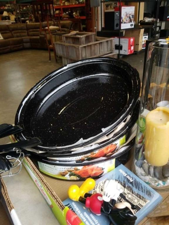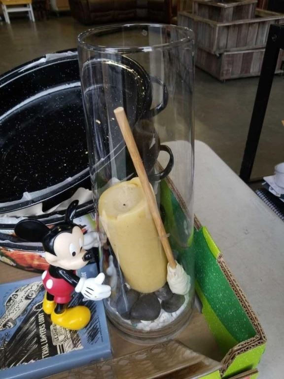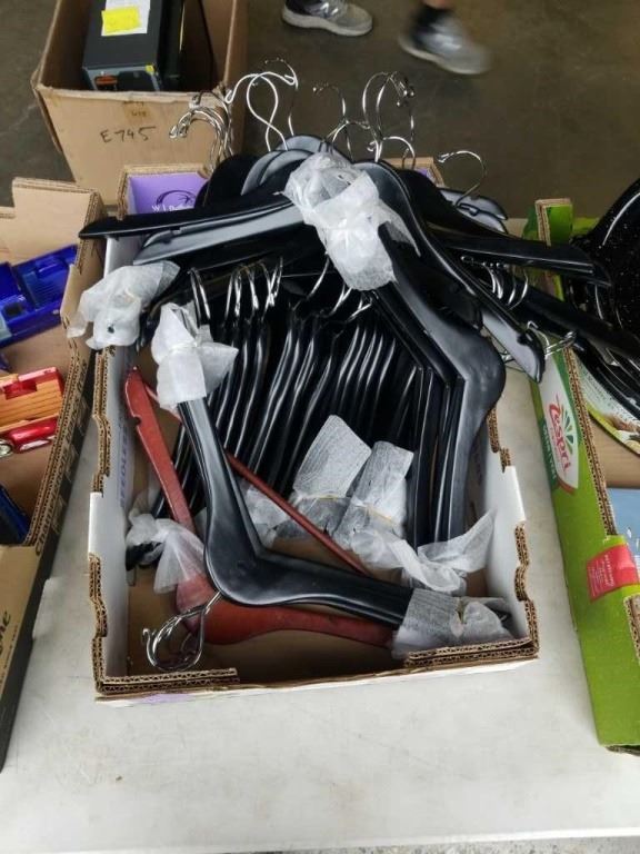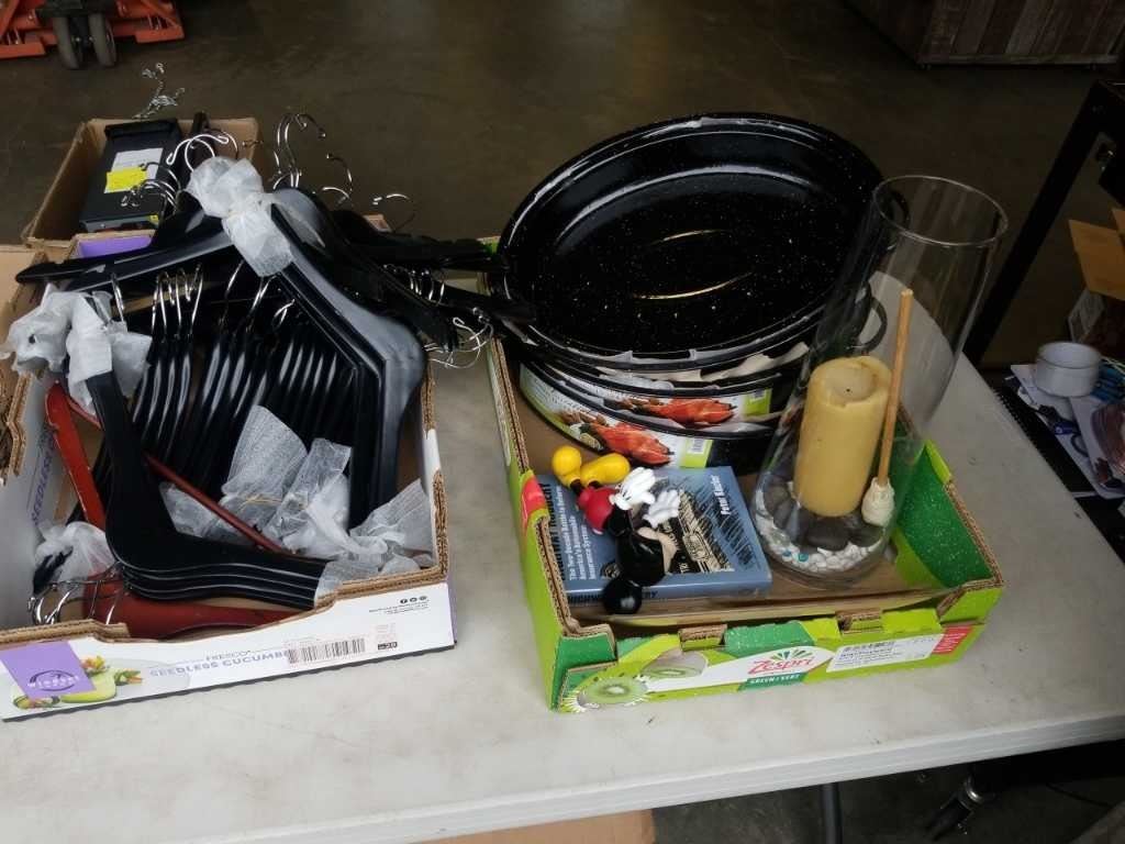 2 TRAYS OF ROASTERS, COAT HANGERS, VASE AND MICKEY MOUSE FIGURE