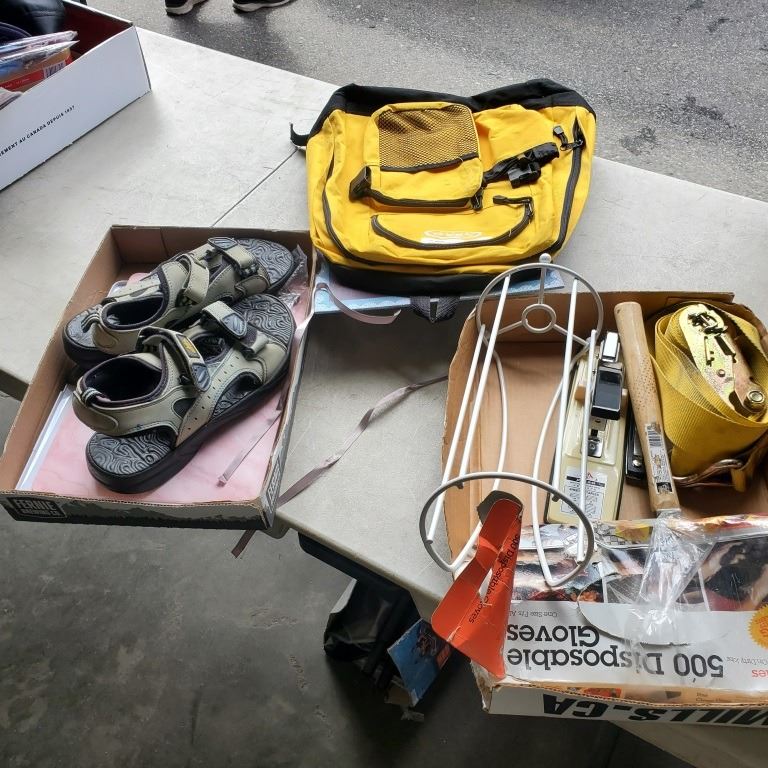 2 TRAYS OF SANDLES, STAPLER, BACKPACK AND TP HOLDER