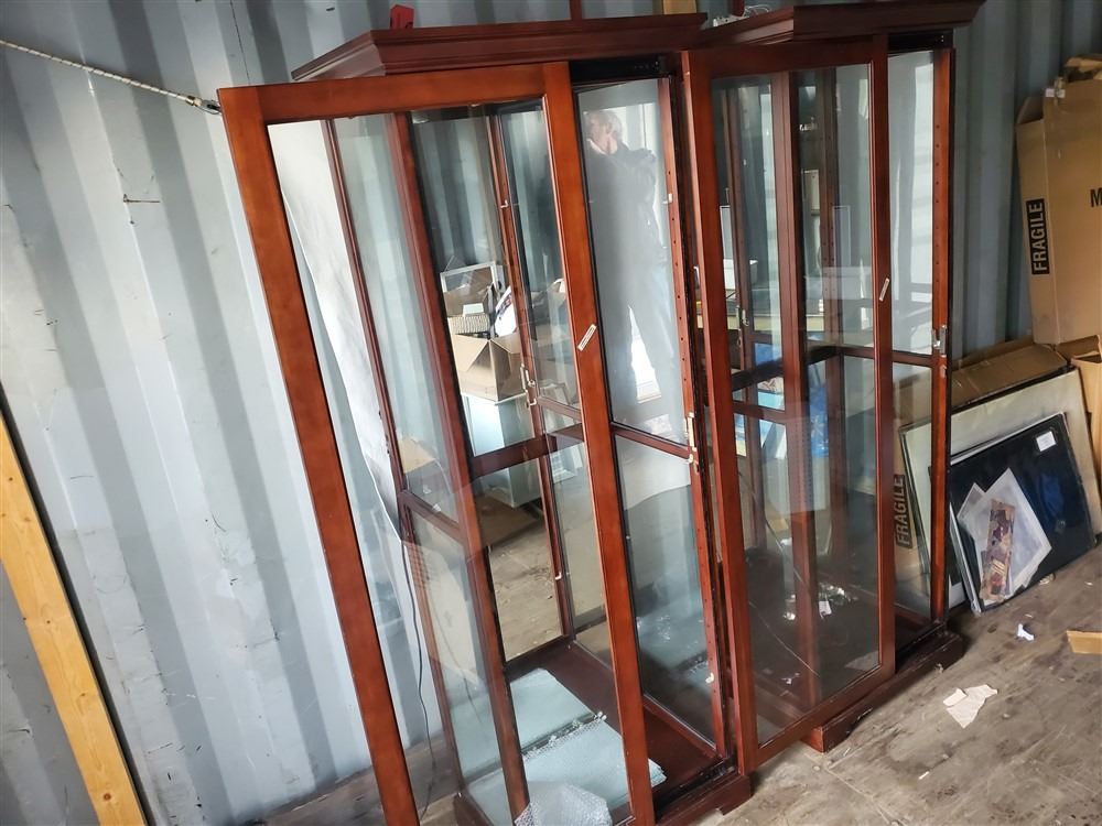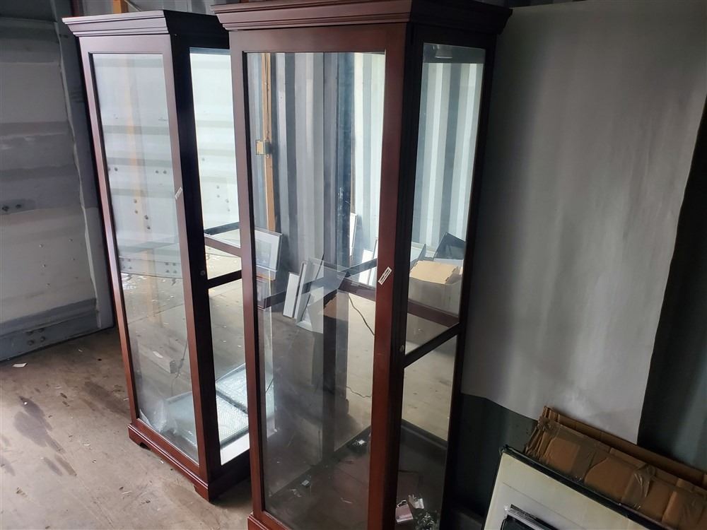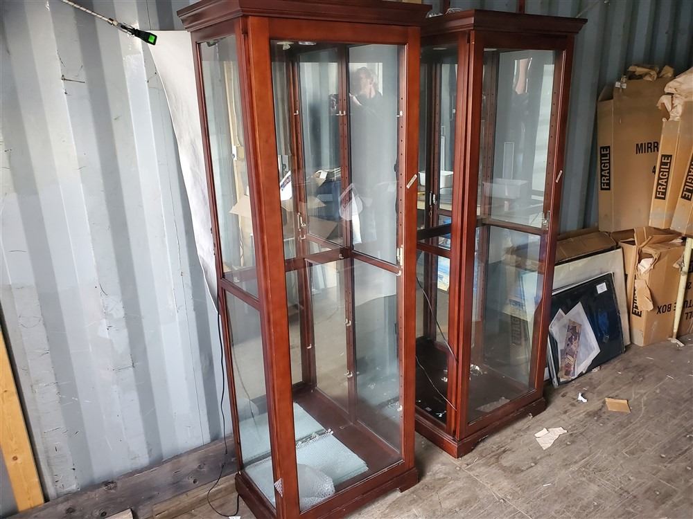2 Tall Glass Cabinets with glass shelves and sliding doors - Most Items have not been tested - Viewing Recommended- 17% Buyer Fee. Payment Processed through Live Auction World ( Visa or Master Card ) pick up Wednesday