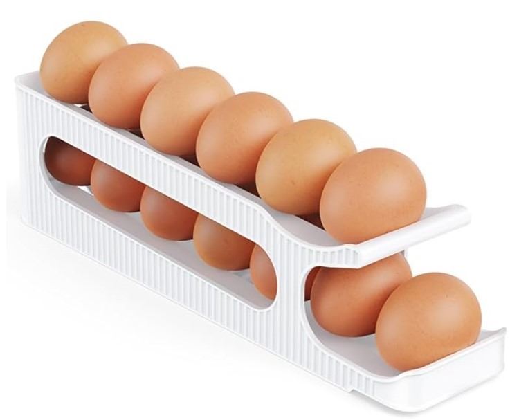 Count of 2 (4 stackable) . Egg Holder for Fridge, 2 Tiers Auto Rolling Egg Storage Organizer for Refrigerator, Slim Space Saving Container, Dispenser