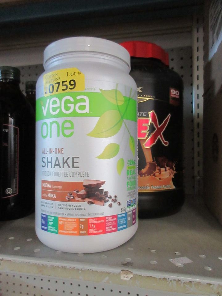 836 g Vega One All-In One chocolate shake (BB: Jan 1, 2024) and 5 lb Allmax Isoflax chocolate peanut butter whey protein isolate (Exp: June 2022).