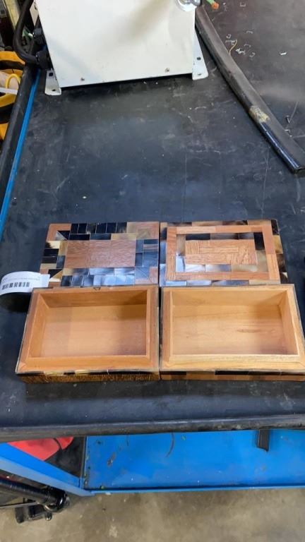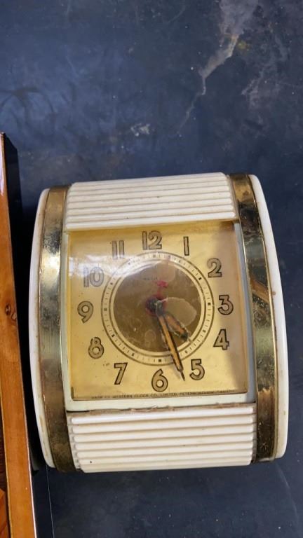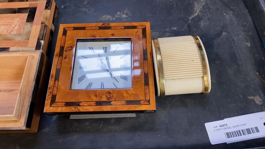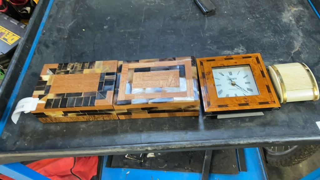 2 VINTAGE CLOCKS AND 2 INLAID DRESSER BOXES