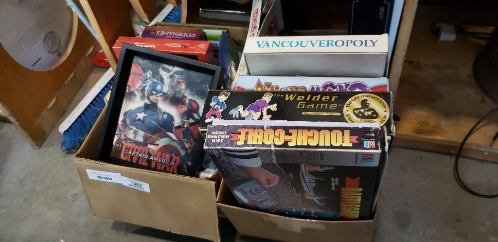 2 VINTAGE PORTABLE TVS AND BOX OF GAMES, MARVEL PRINT