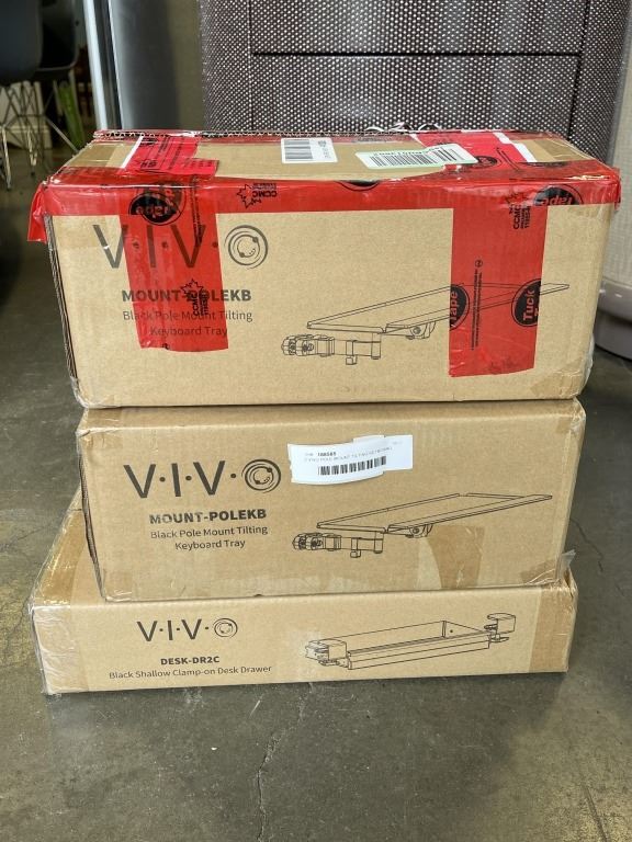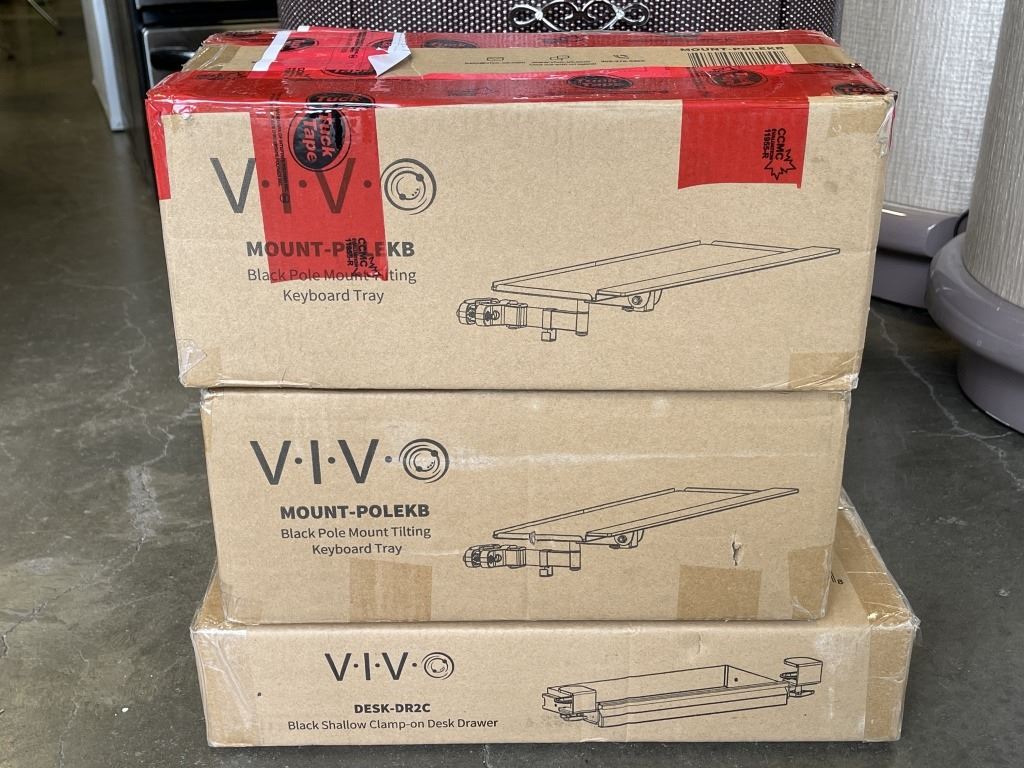 2 VIVO POLE MOUNT TILTING KEYBOARD TRAYS, AND UNDER DESK CLAMP ON DRAWER