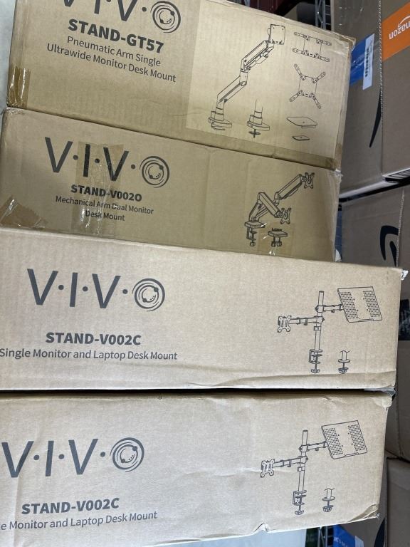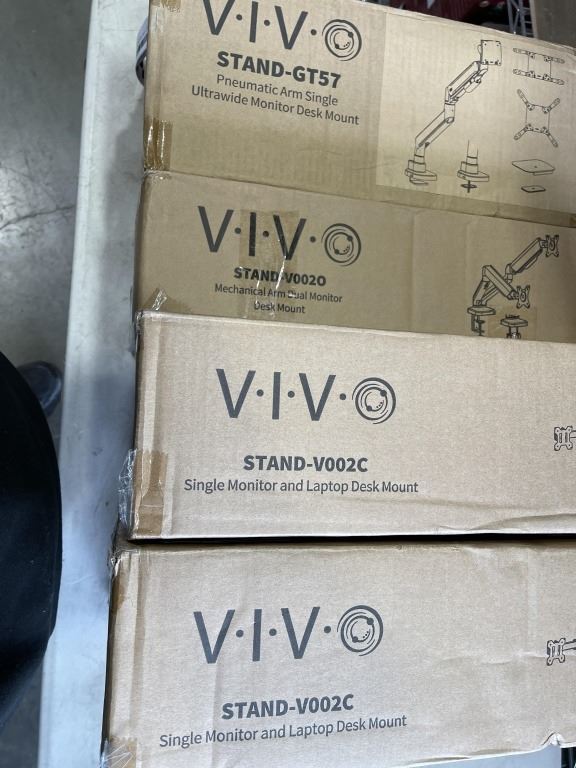 2 VIVO SINGLE MONITOR AND LAPTOP DESK MOUNTS, SINLE MONITOR PENUYMATIC AULTRA WIDE DESK MOUNT, AND MECHANICAL ARM DUAL MONITOR DESK MOUNT