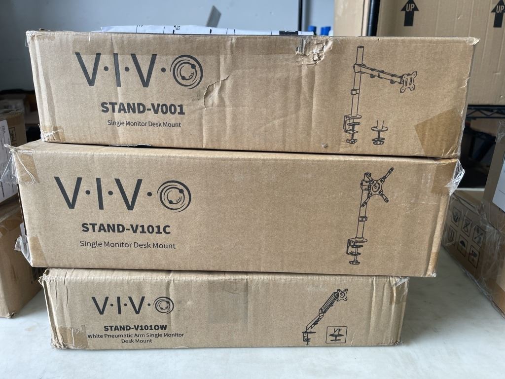 2 VIVO SINGLE MONITOR DESK MOUNTS, AND VIVO SINGLE MONITOR PNEUMATIC ARM MOUNT