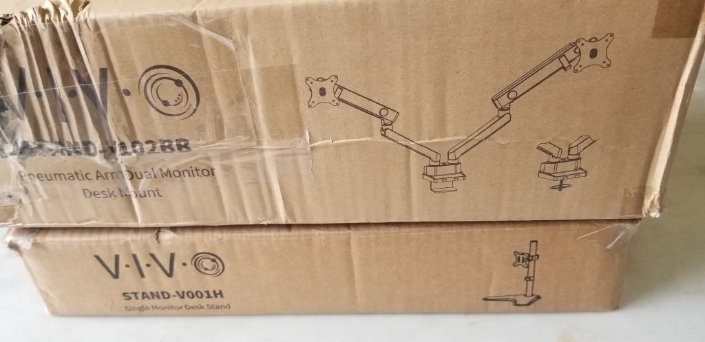 2 VIVO SINGLE MONITOR DESK MOUNTS, VIVO PNEUMATIC ARM DUAL MONITOR DESK MOUNT, AND SINGLE MONITOR DE