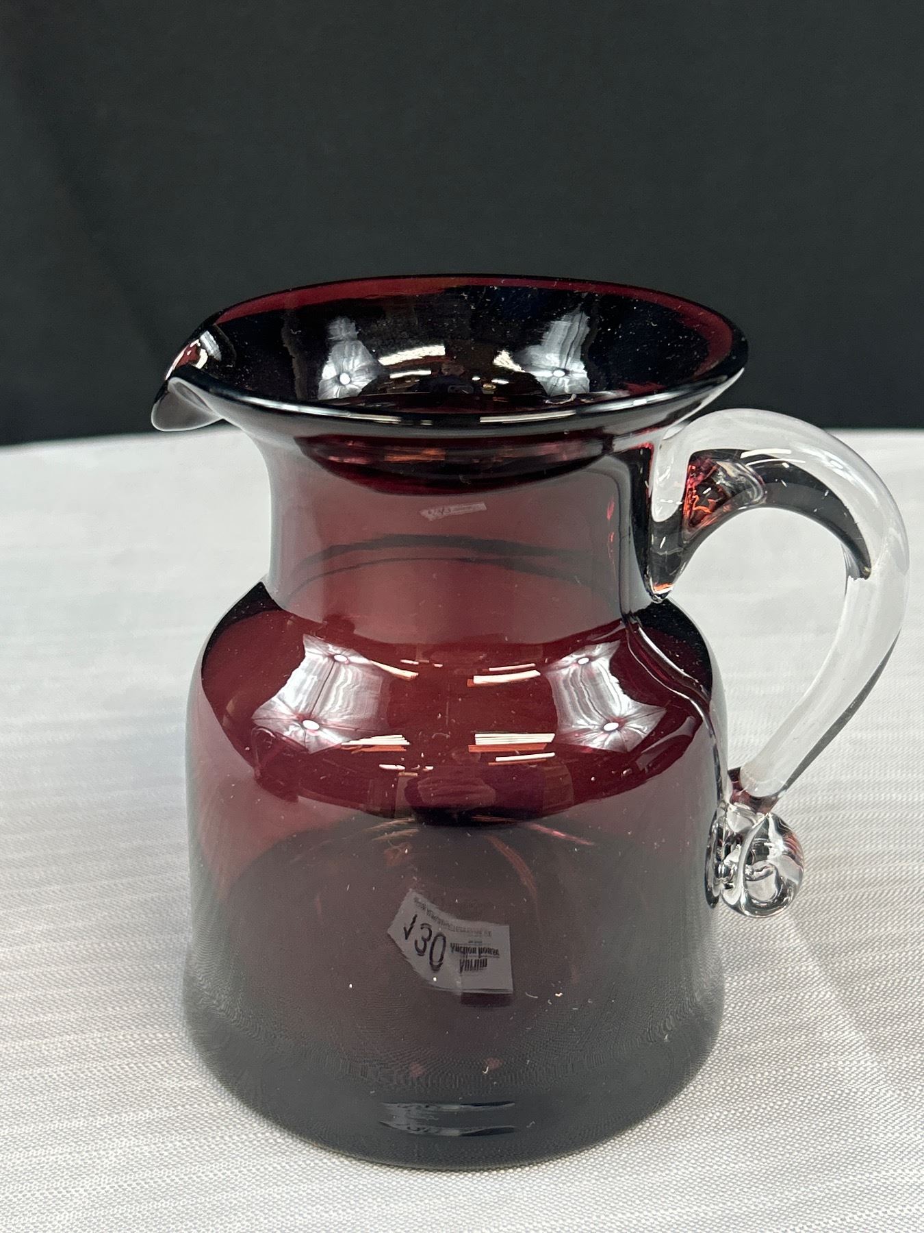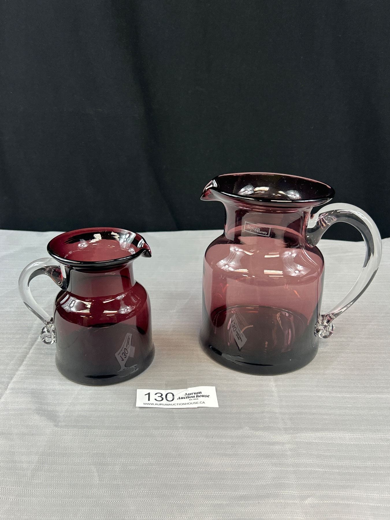 2 Vintage Amethyst Purple Hand Blown Glass Pitchers - 9 1/4" x 5" Across Base and 4" X 3 1/8th" Across Base - EUC
