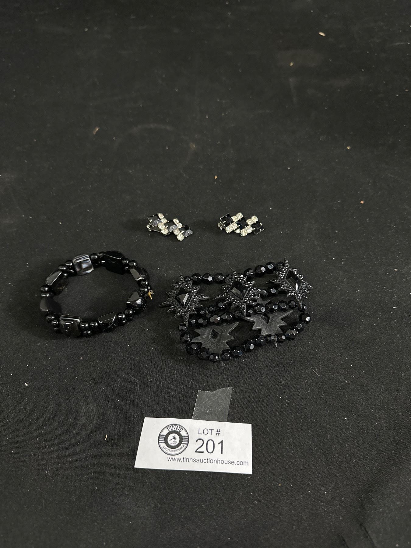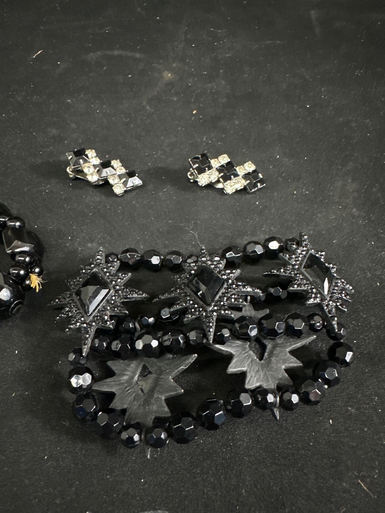 2 Vintage Black Glass Bracelets and Black White Rhinestone Earrings