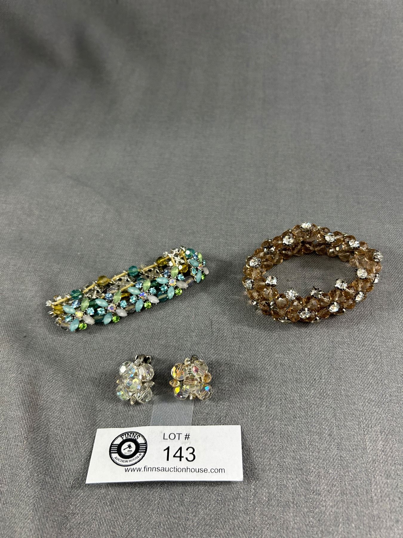 2 Vintage Crystal Beads & Rhinestones Bracelets & 1 Pair Clip On Earrings