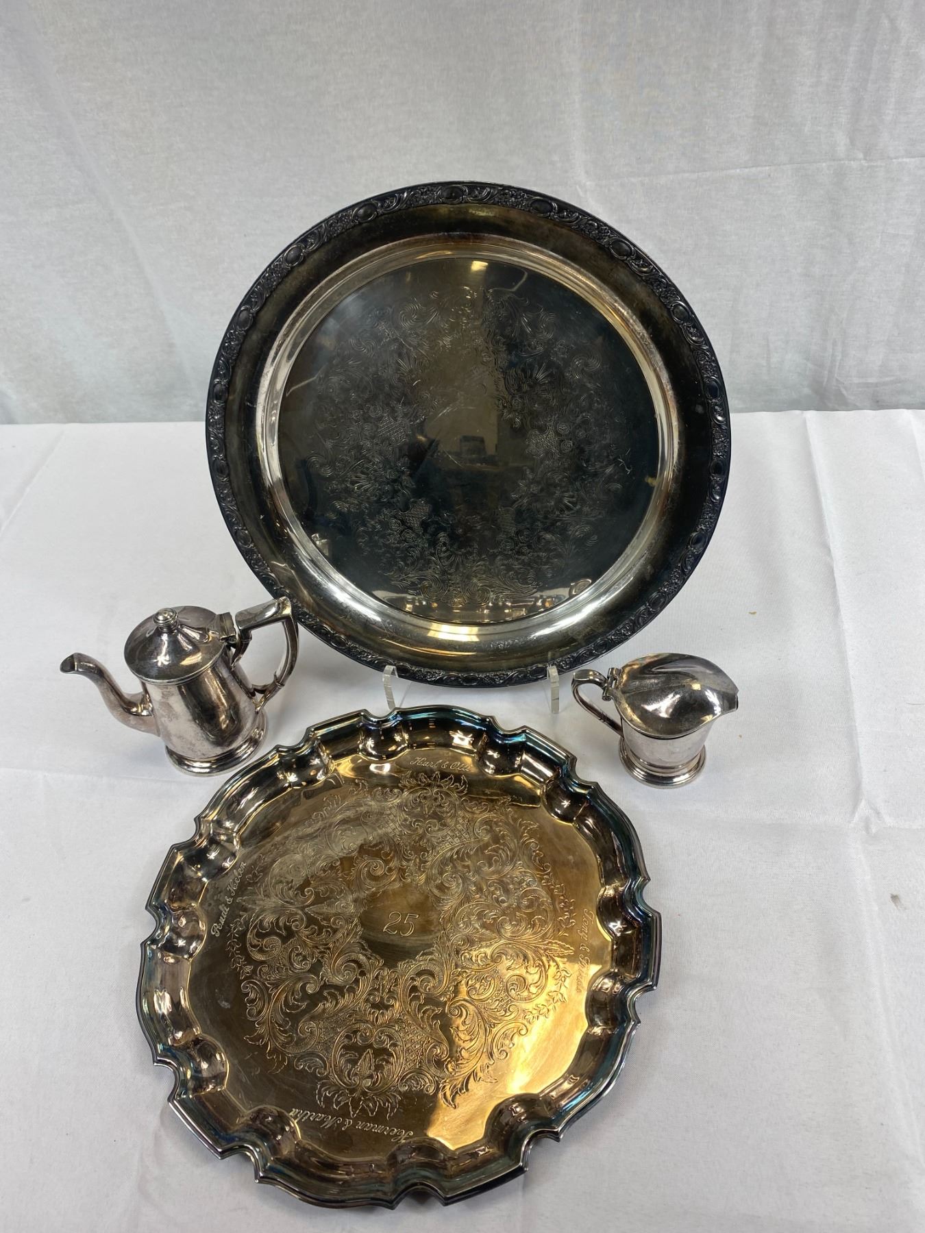 2 Vintage Highly Engraved Silver Plate Serving Trays And Silver Plate Cream And Sugar Set