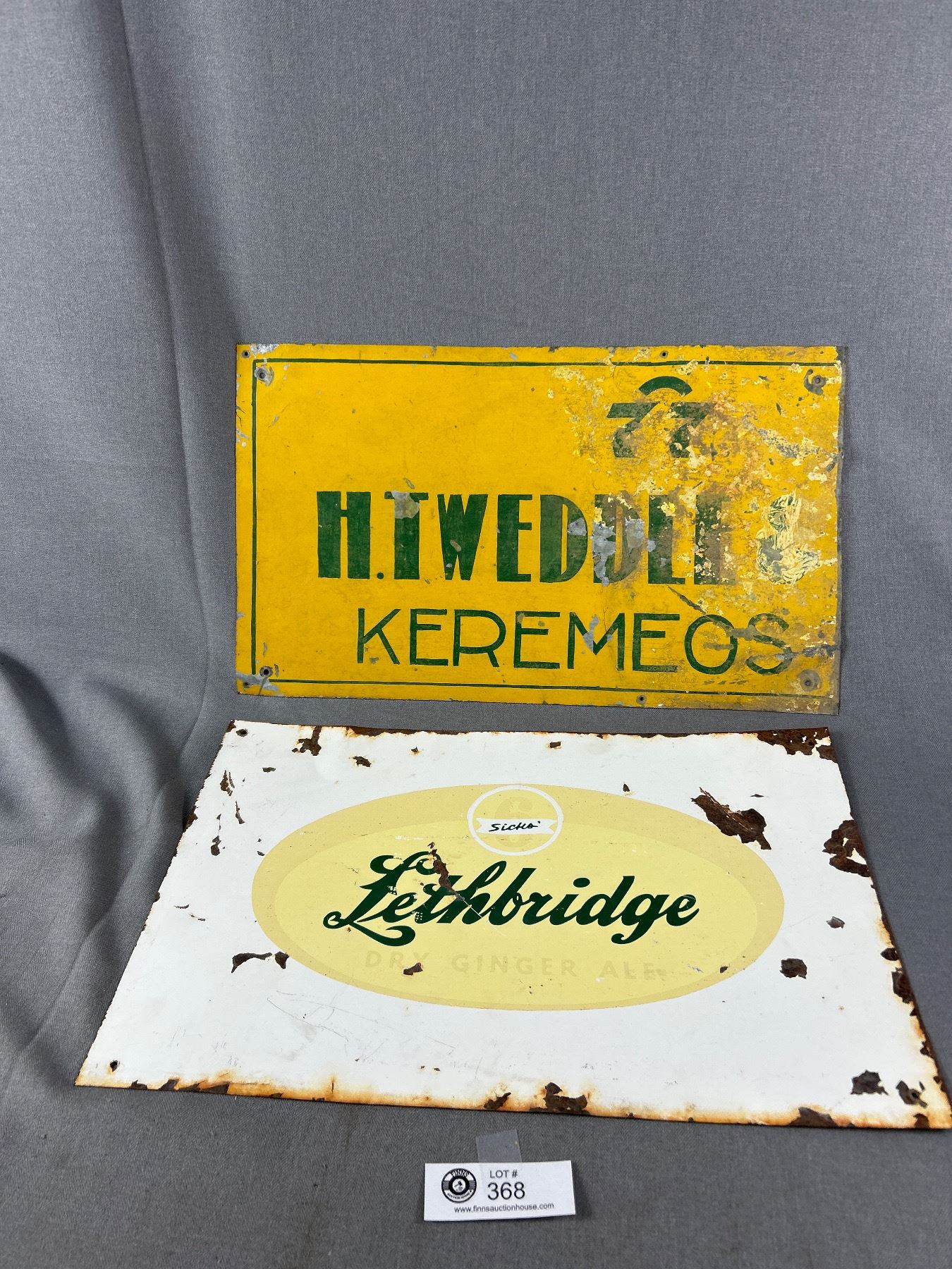 2 Vintage Metal Signs - H.T. Weddle, Keremeos. Approx. 17" x 10" & Sick's Lethbridge GingerAle. Approx. 10 1/2" x 16 1/2"