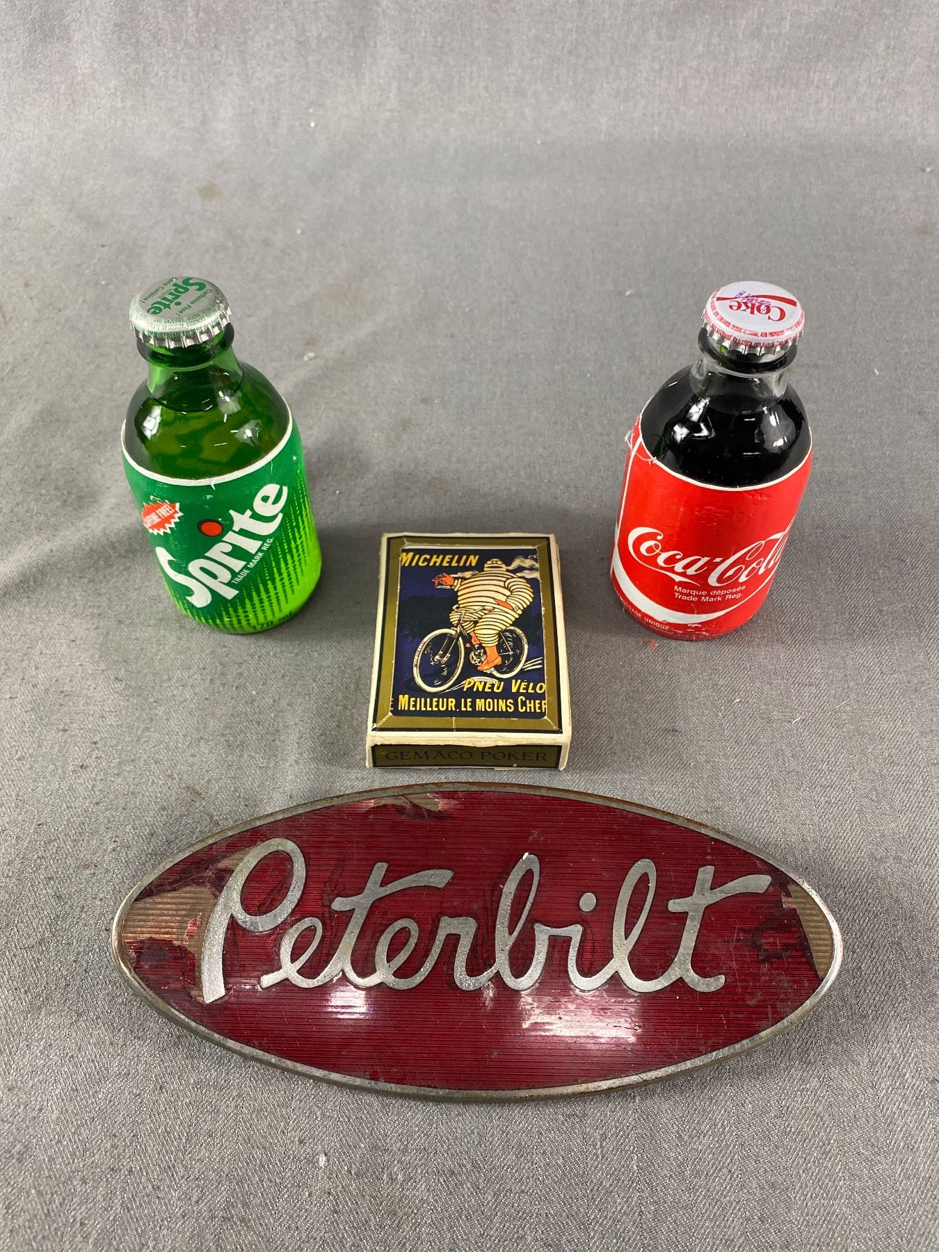 2 Vintage Mini Soda Pop Bottles, Michelin Playing Cards & Peterbilt 8" Metal Decal