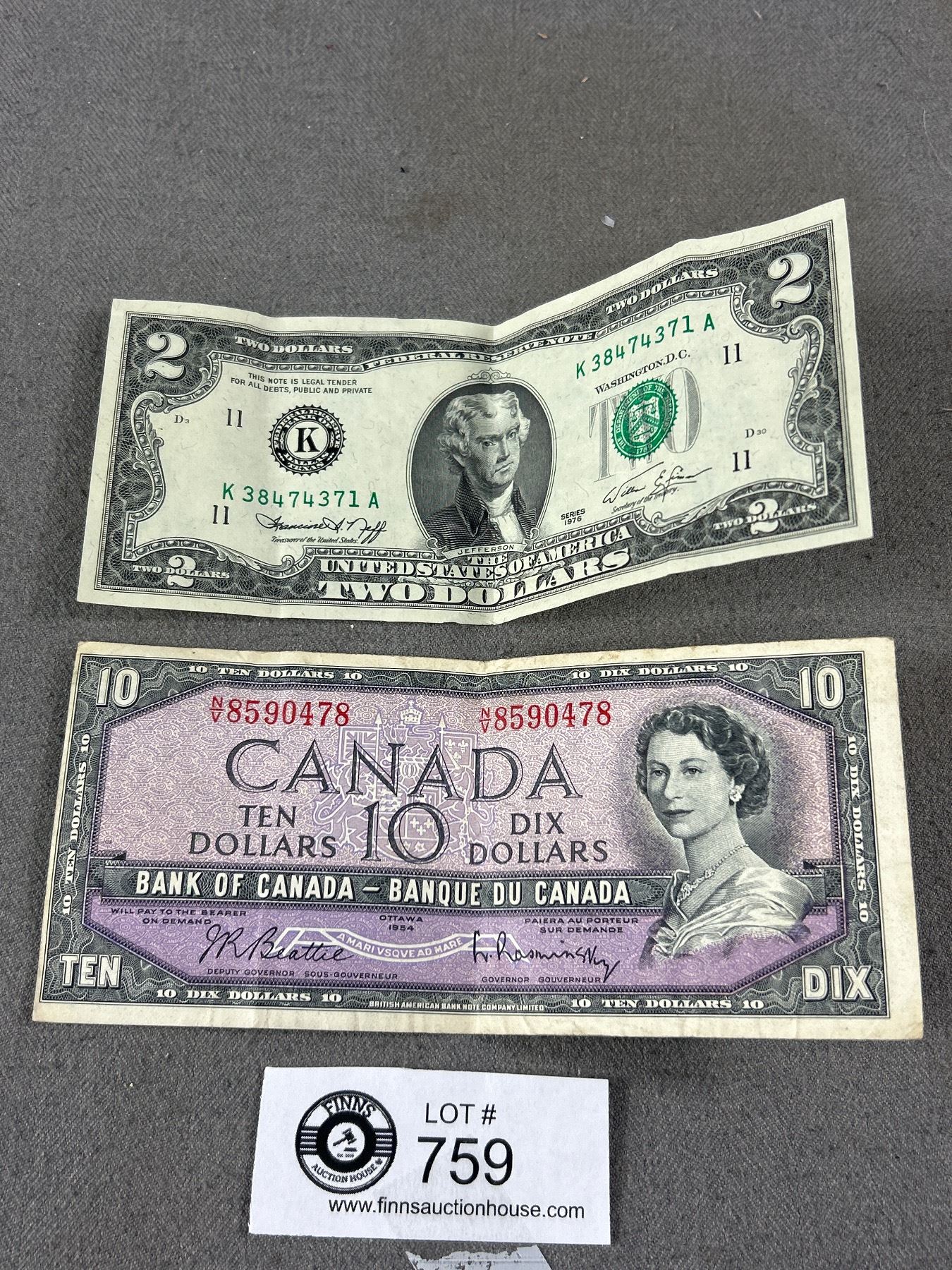 2 Vintage Paper Bills, $10.00 CAD & $2.00 USD