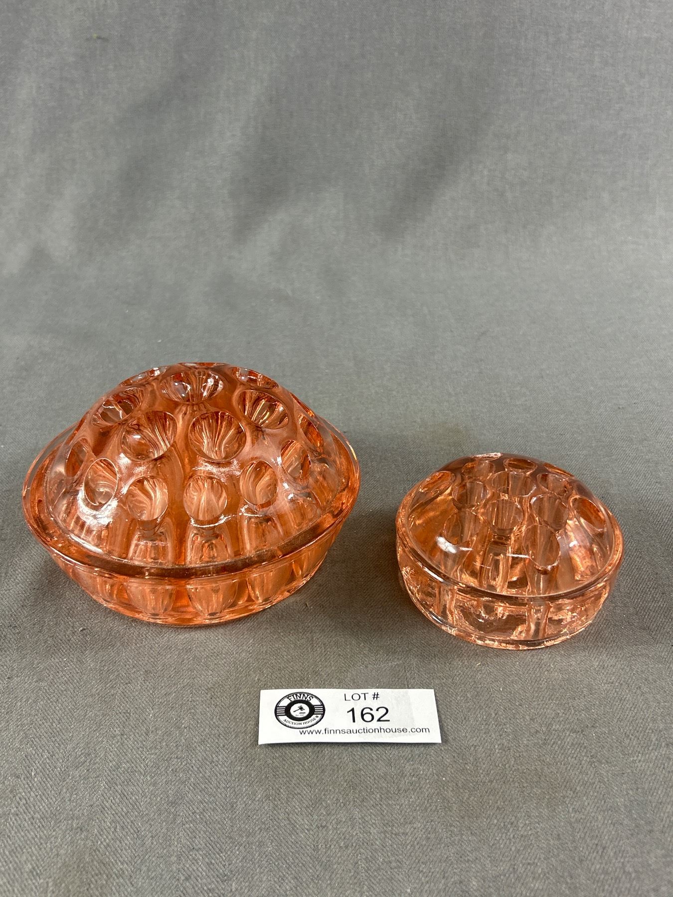 2 Vintage Pinkish Orange Coloured Glass "Frogs". Largest Is 5" Diam. Marked "PAT'D APRIL 11 1916. Other Is 3.5" Diam Unmarked
