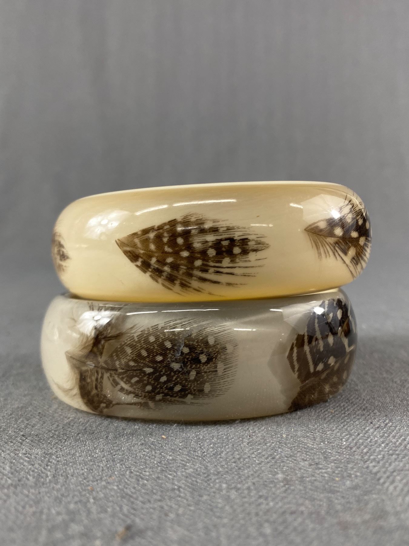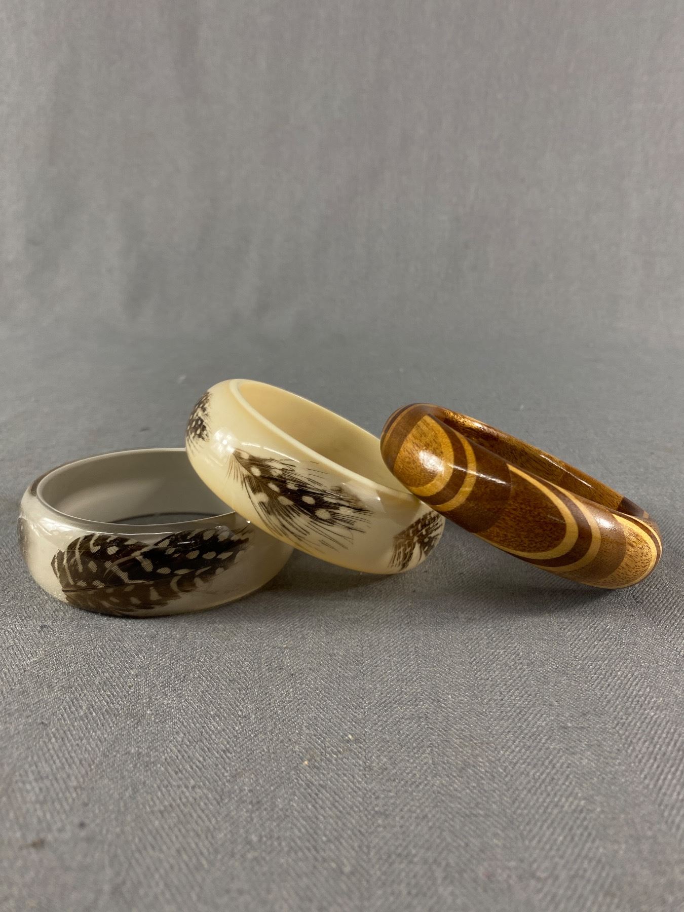 2 Vintage Real Feather Bracelets & 1 Handcrafted Inlay Wood Bracelet