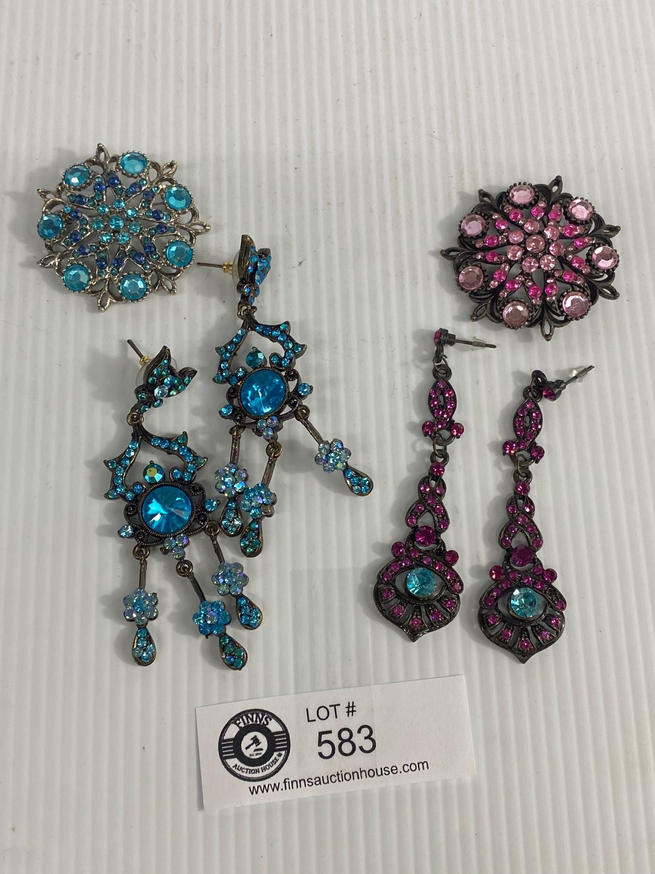 2 Vintage Rhinestone Brooches w/1 Pair Of Rhinestone Earrings