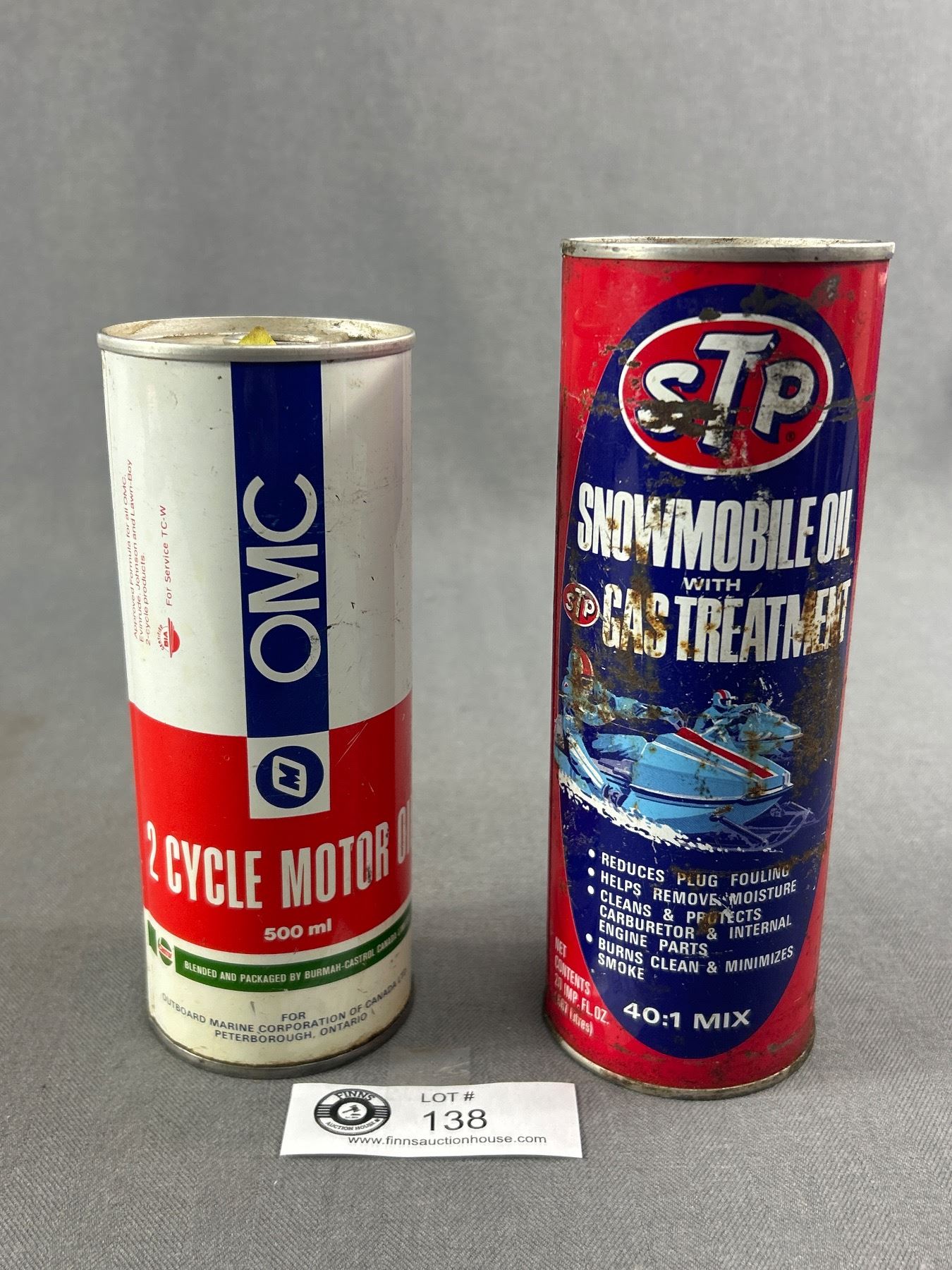 2 Vintage Tin Cans w/ Contents - STP Snowmobile Oil w/ Gas Treatment & Castrol OMC 2 Cycle Motor Oil