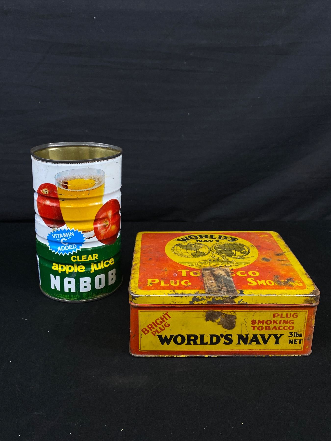 2 Vintage Tins. Nabob Apple Juice Can (No Lid) & World's Navy Tobacco Tin.