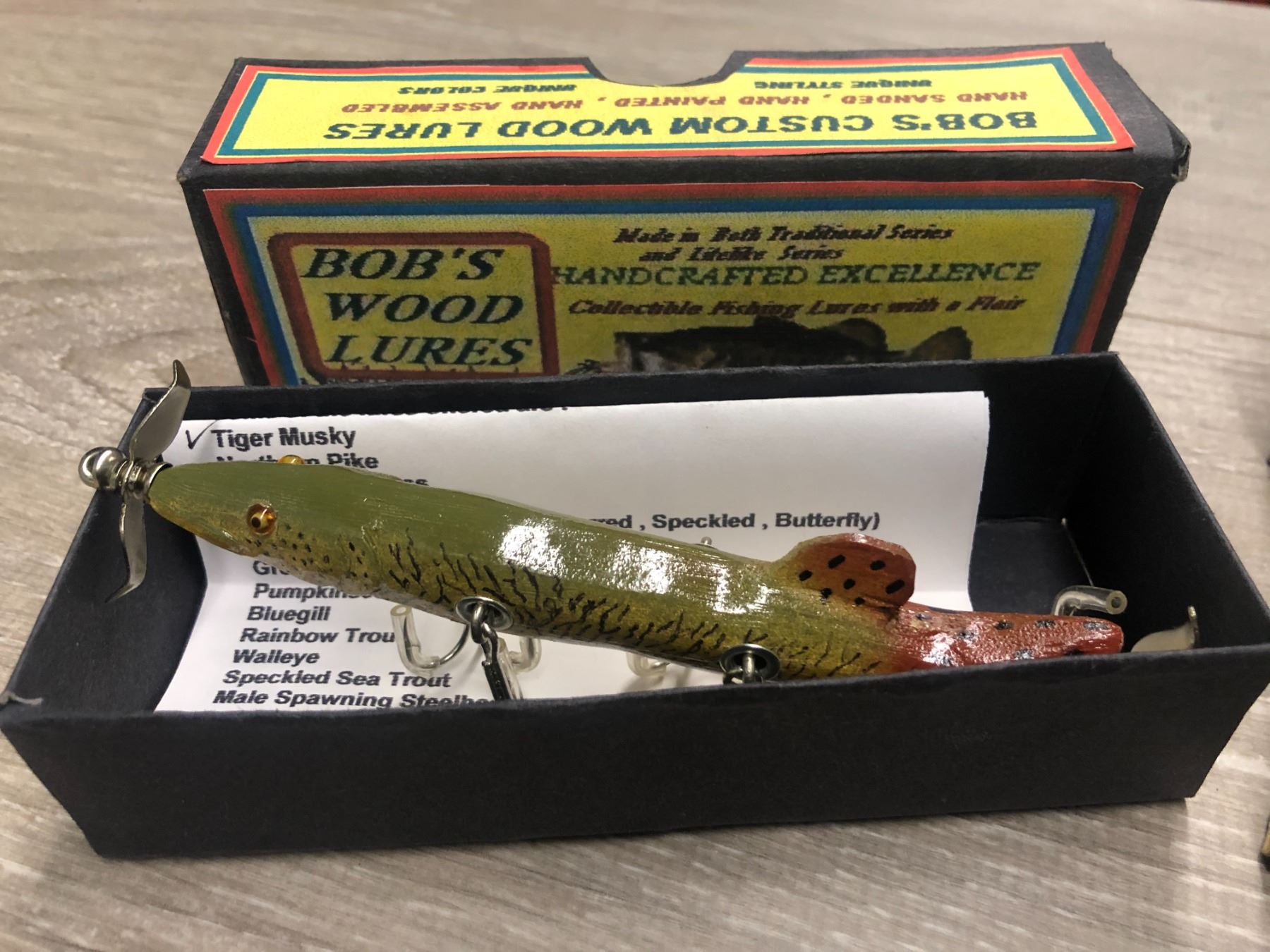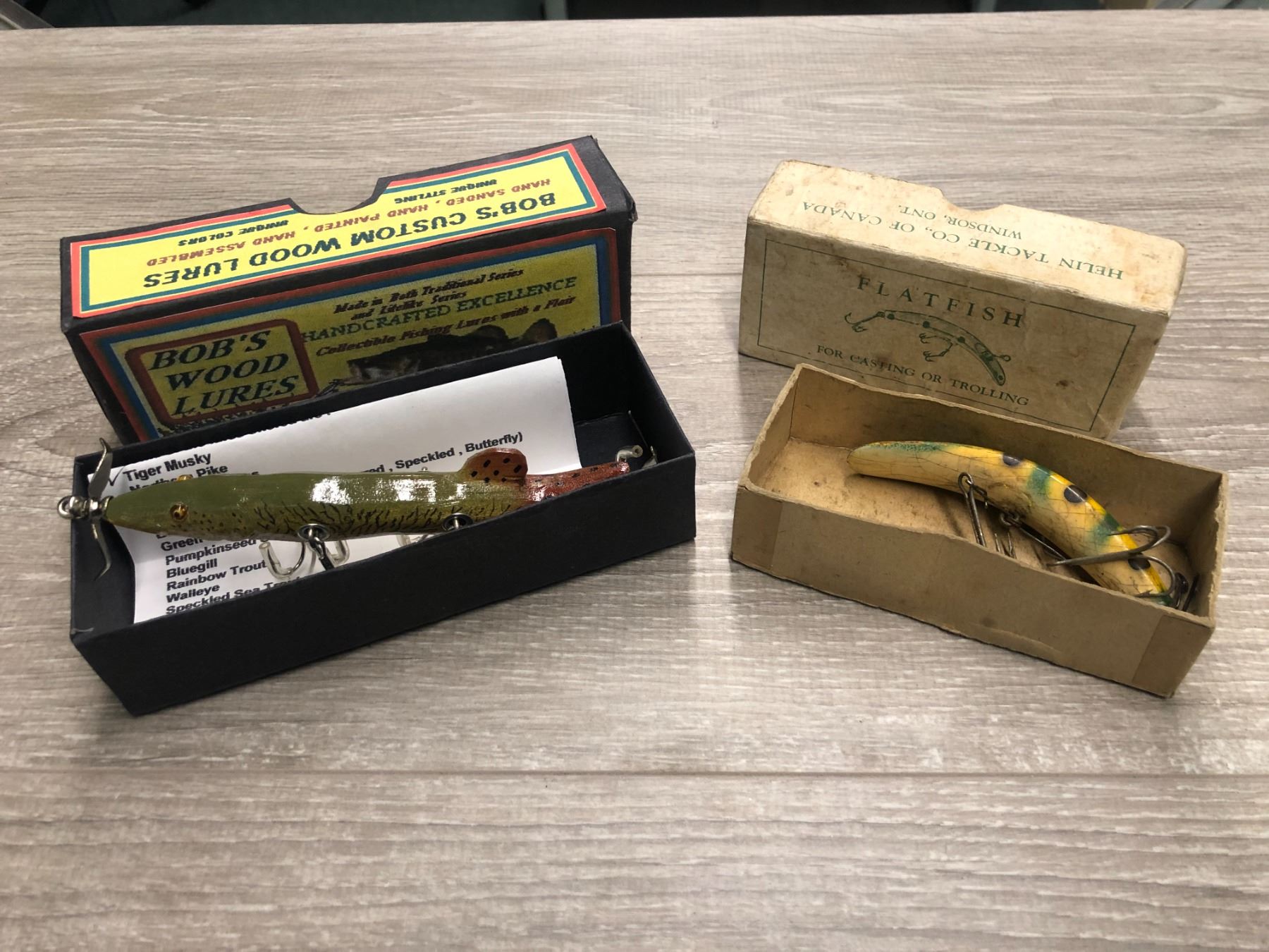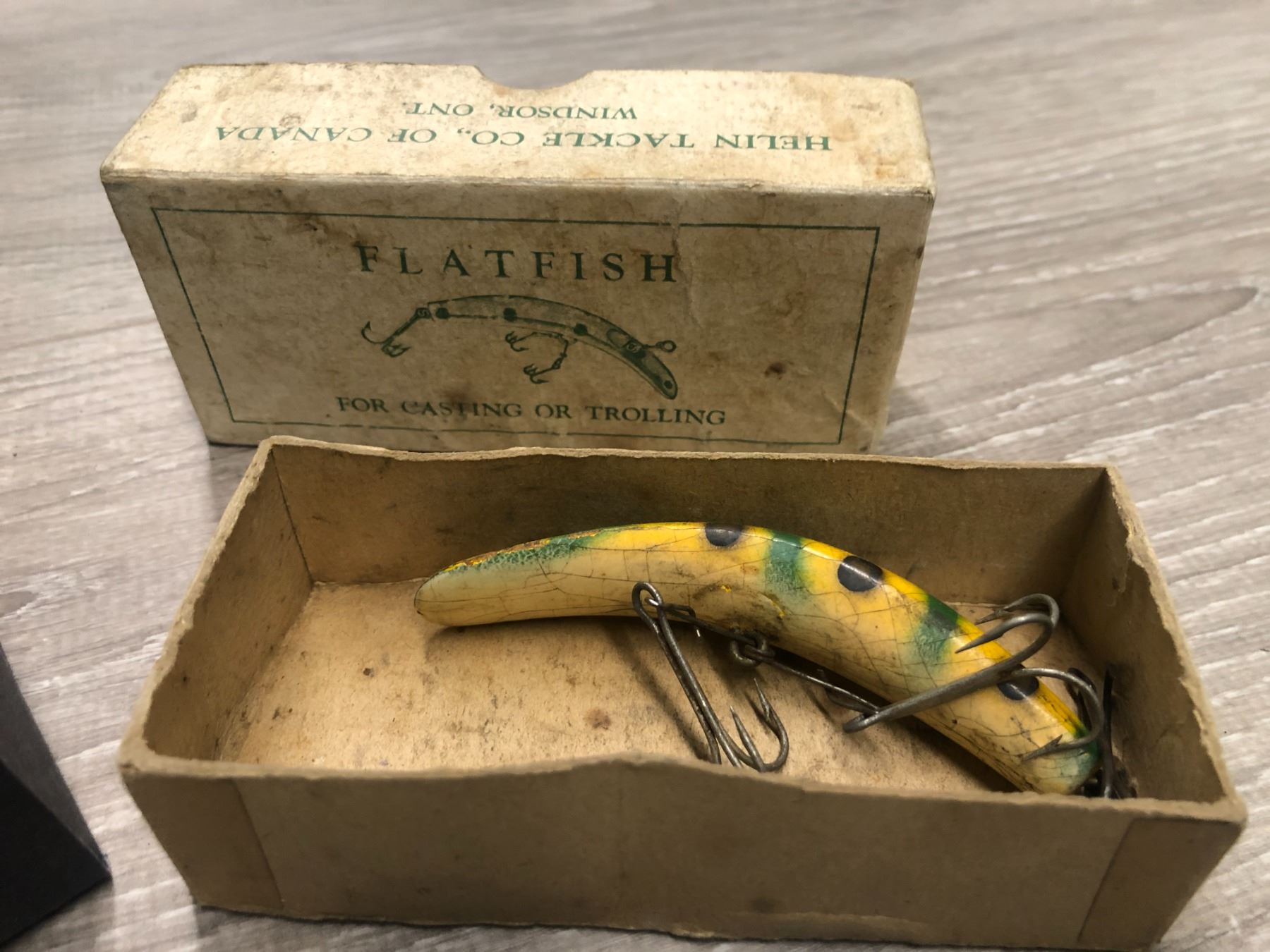 2 Vintage fishing lures w/ original box - bobs wood lures & helin tackle company flat fish