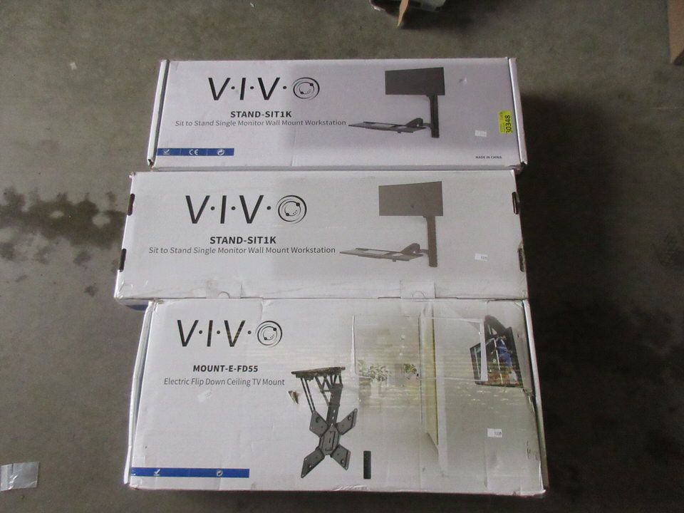 Electric flip down TV ceiling mount (MOUNT-E-FD55), and 2 STAND-SIT1K wall mount sit stand desks.