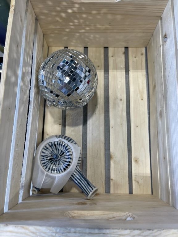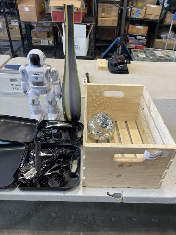 2 WAHL TRIMMER KITS, ROBOT, DISCO BALL, WOOD CRATE AND VASE ETC