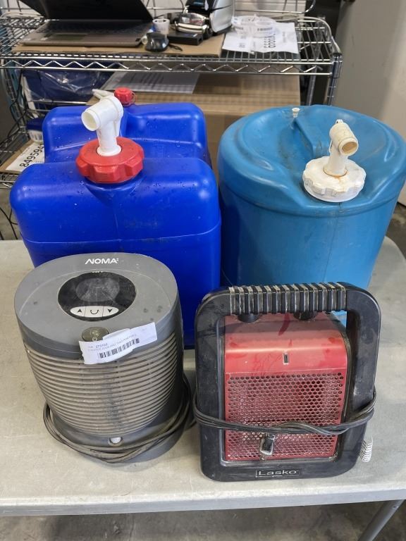 2 WATER JUGS AND TWO PORTABLE HEATERS