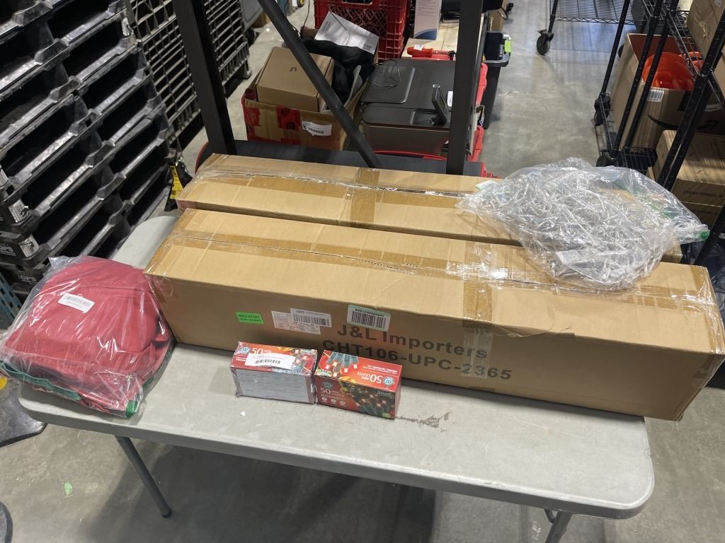 2 WHITE 6FT ARTIFICIAL HOLIDAY TREES, STORAGE BAG AND ASSORTED LIGHTS