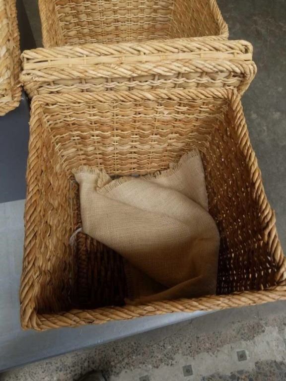 2 WICKER BASKETS AND GREY STORAGE BOX