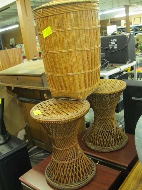 2 WICKER PLANT STANDS & A WICKER HAMPER
