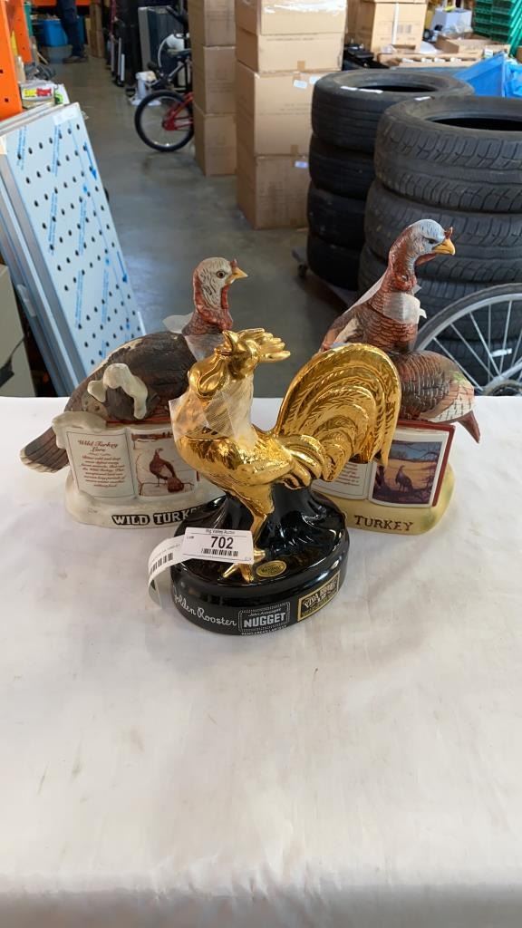2 WILD TURKEY DECANTERS CA 1980-81 AND GOLDEN ROOSTER DECANTER CA 1969