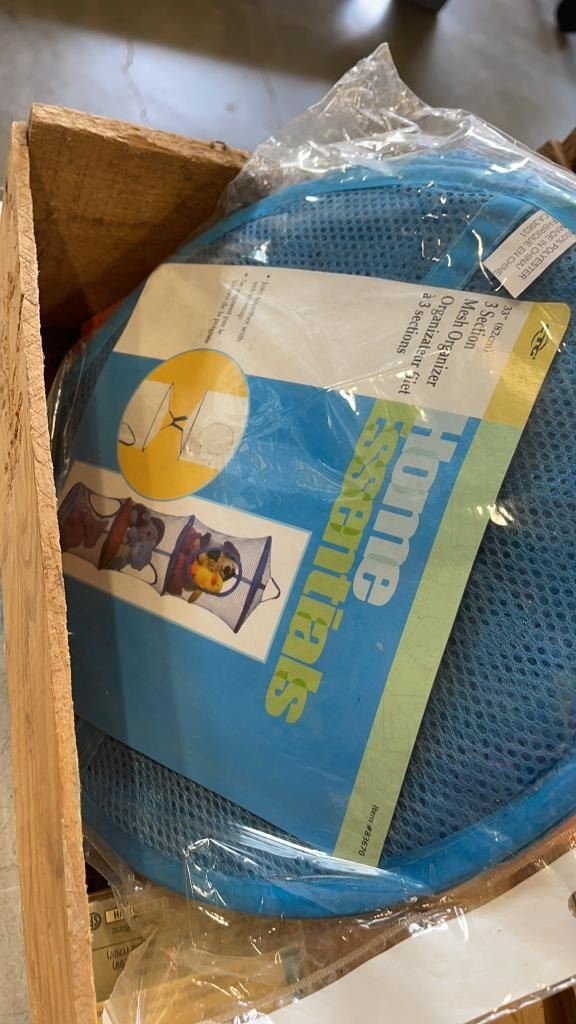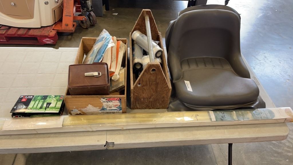 2 WOOD CRATES OF FILTERS, MESH ORGANIZER,LAWN MOWER SEAT AND BLINDS