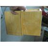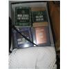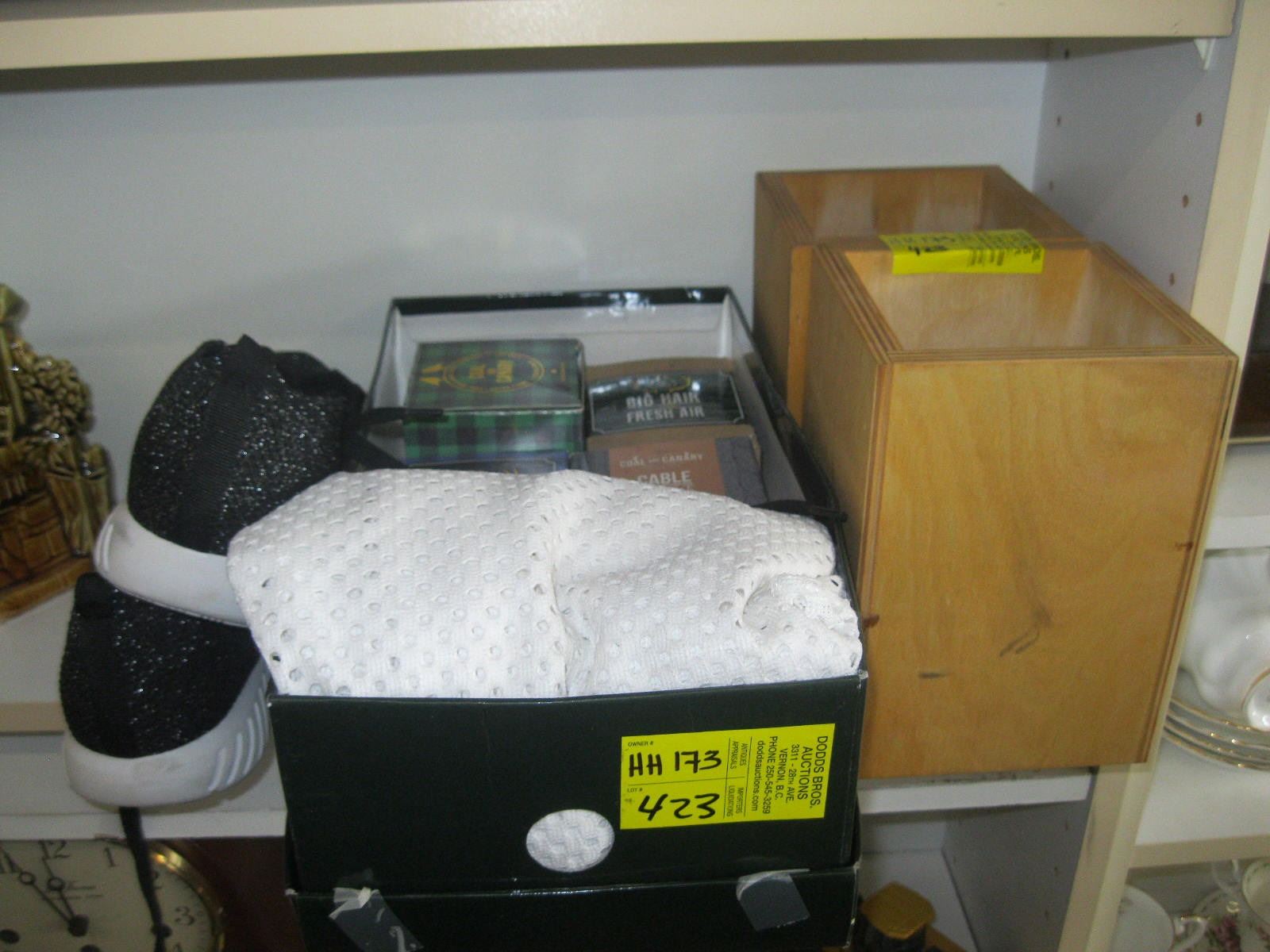 2 WOODEN CANDLE STANDS W/CANDLES, SHOES & BAG