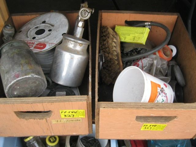 2 WOODEN CRATES OF TAPE MEASURES, PAINT SPRAYERS, MISC ETC.