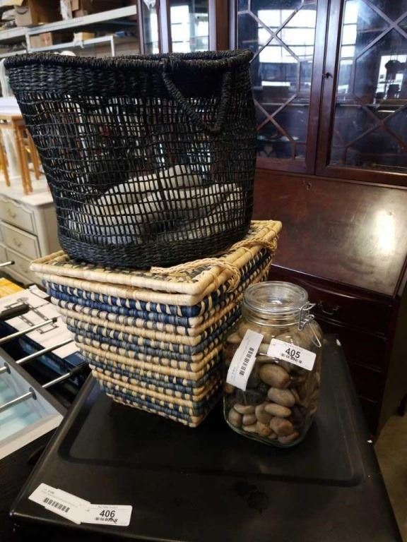 2 WOVEN BASKETS AND GLASS JAR WITH STONES